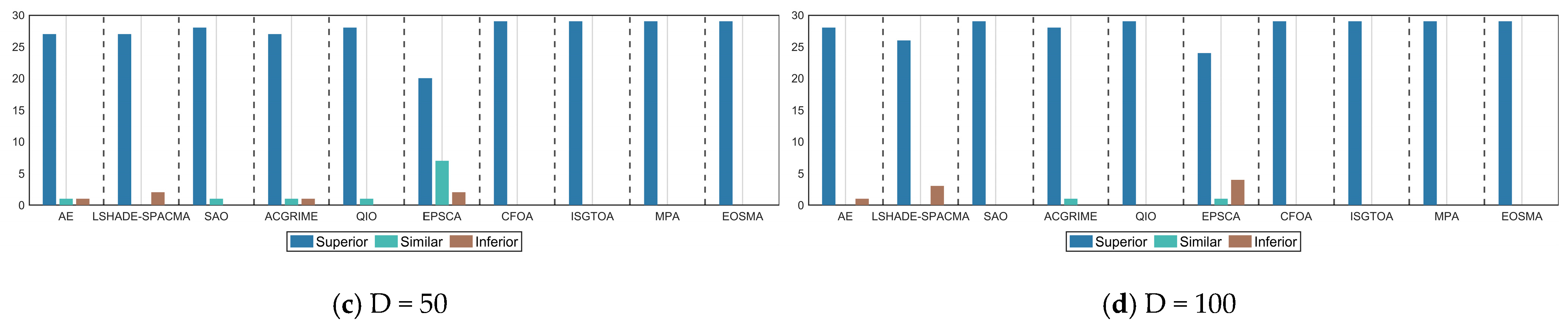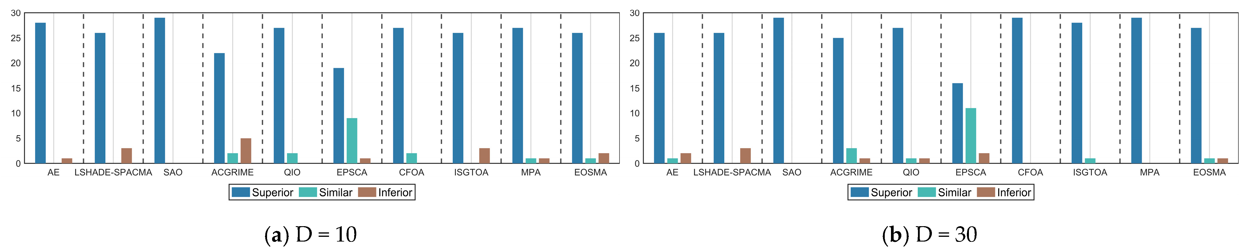 | ERBMO vs. (+/=/−) | Dimension | AE | LSHADE-SPACMA | SAO | ACGRIME | QIO | EPSCA | CFOA | ISGTOA | MPA | EOSMA |