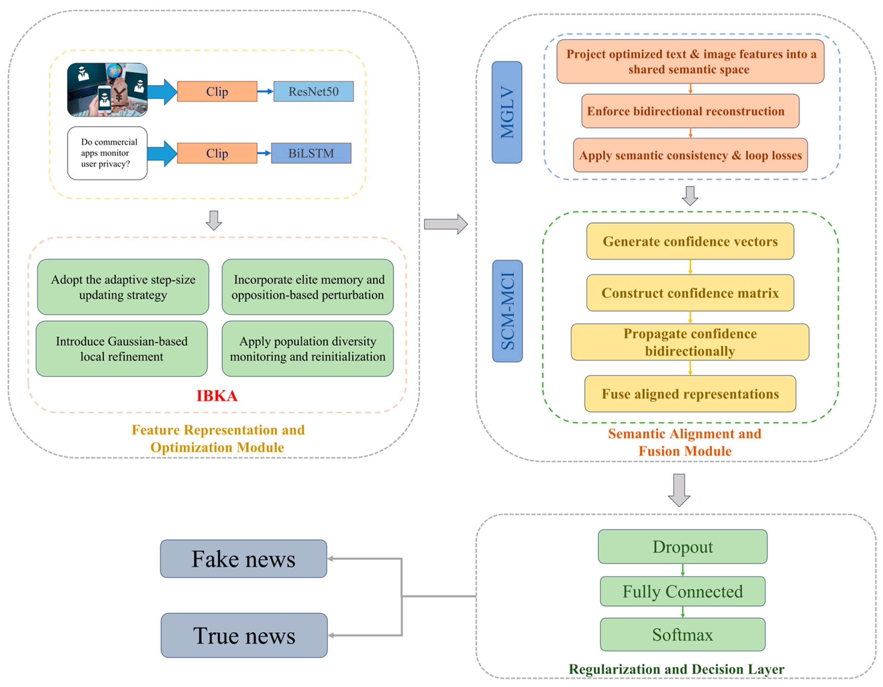 APA StyleMu, G., Dai, J., Li, C., & Li, J. (2025). IBKA-MSM: A Novel Multimodal Fake News Detection Model Based on Improved Swarm Intelligence Optimization Algorithm, Loop-Verified Semantic Alignment and Confidence-Aware Fusion. Biomimetics, 10(11), 782. https://doi.org/10.3390/biomimetics10110782