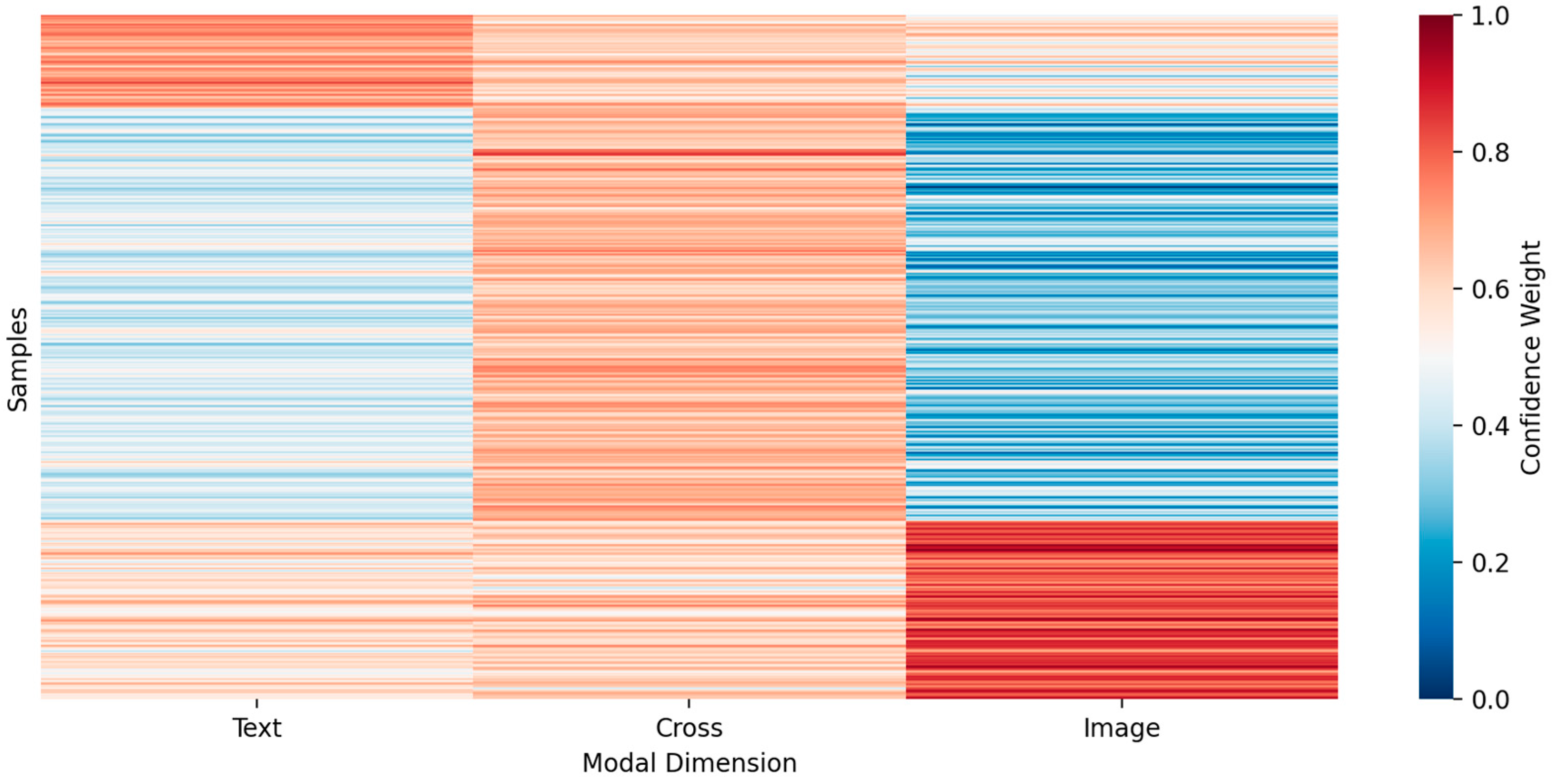 - We construct a Semantic Confidence Matrix and Modality-Cross Interaction mechanism (SCM-MCI) for adaptive confidence modeling and deep semantic interaction across modalities. The SCM module dynamically evaluates modality reliability during fusion based on semantic confidence distribution and adjusts contribution weights accordingly. On this basis, the MCI module introduces a bidirectional semantic propagation strategy to enhance semantic complementarity and information consistency, enabling highly correlated and stable fused representations in the shared semantic space.