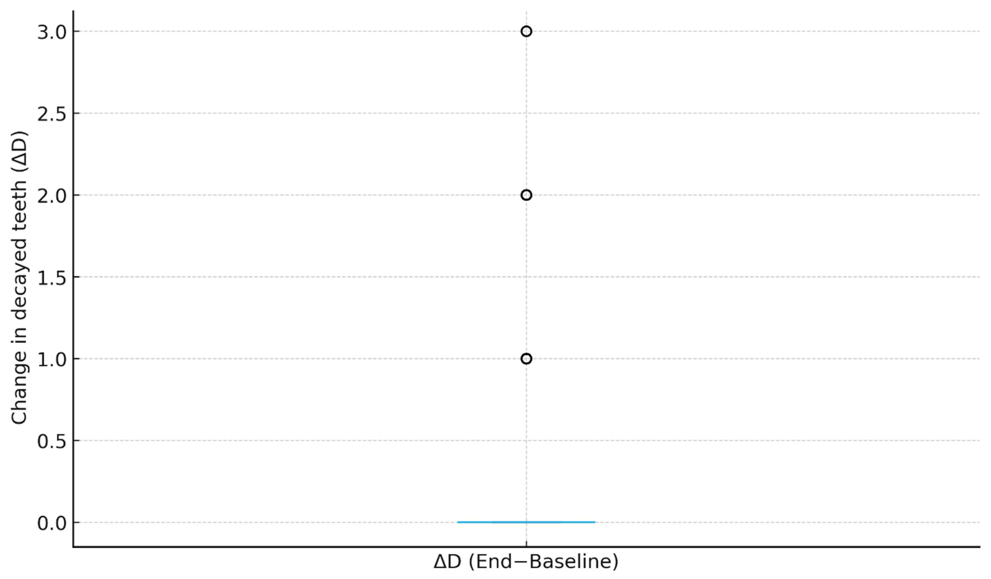 | Δ Decayed (End–Baseline, mean ± SD) | 0.29 ± 0.64 |