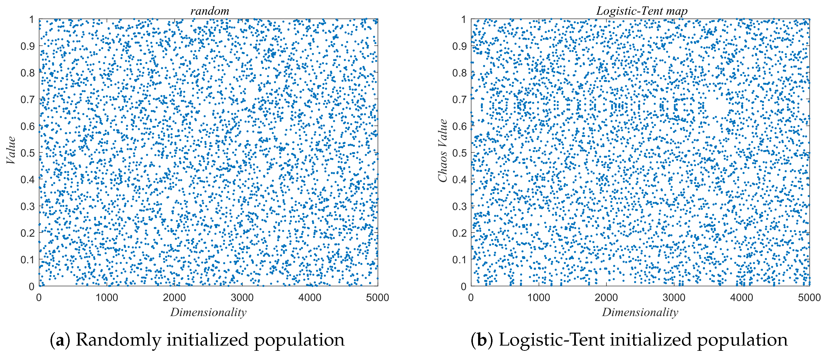 First, a Logistic-tent chaotic map is introduced to initialize the population. Compared to the random initialization in the standard RBMO, this strategy significantly enhances the diversity of the initial population, enabling the algorithm to more uniformly explore the entire solution space during the initial search phase, thereby laying a solid foundation for subsequent global optimization and rapid convergence.
