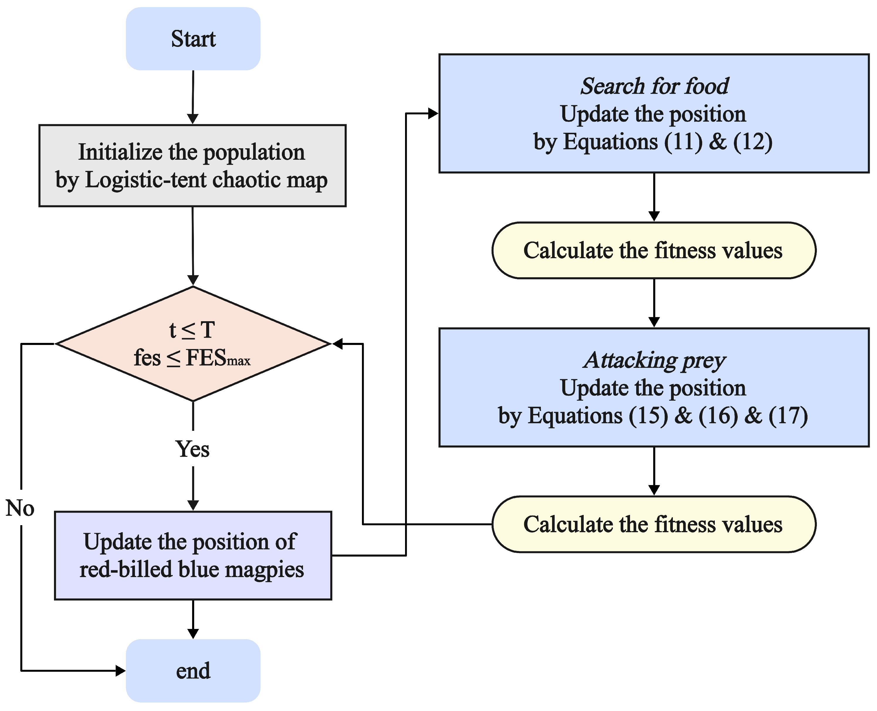 91]. The algorithm was successfully applied to the 3D path planning problem for UAVs, yielding impressive results. To achieve its optimization goals, RBMO models the primary foraging strategies of the red-billed blue magpie, namely its techniques for finding food, attacking prey, and caching supplies. However, the algorithm’s proven effectiveness is constrained by an insufficient global search capability, which creates a vulnerability to premature convergence in local optima. To address these shortcomings, Zhang et al. [