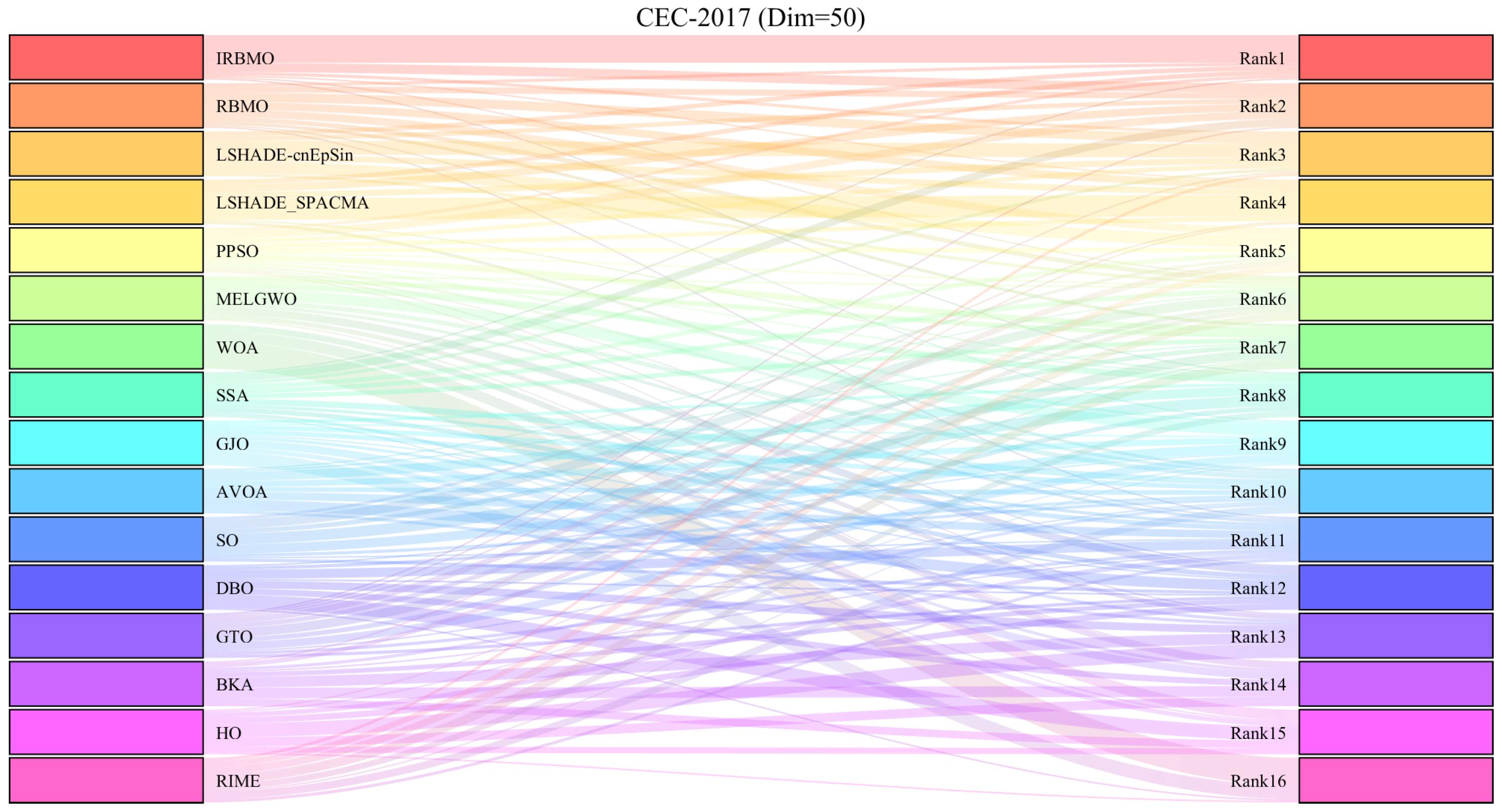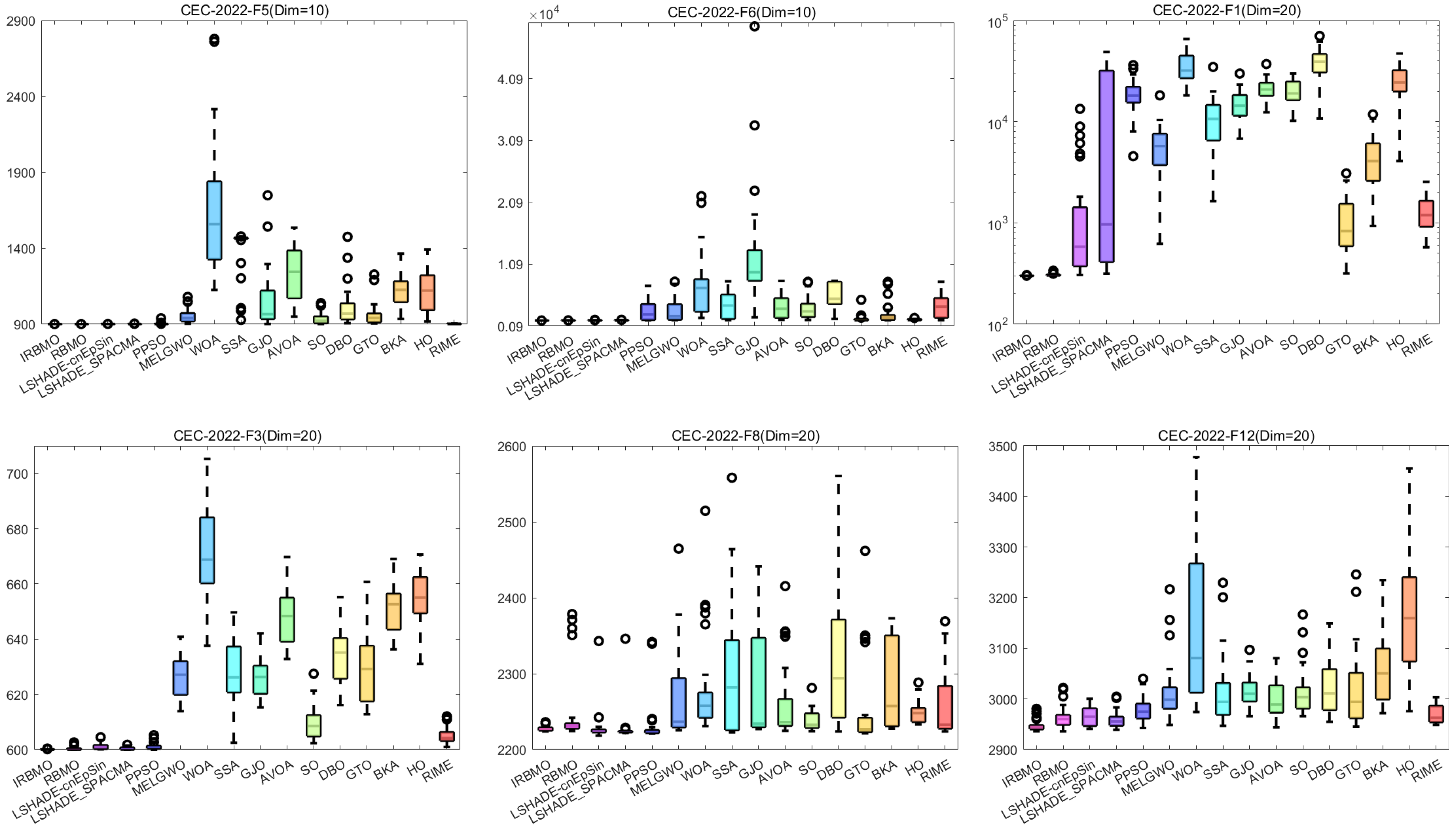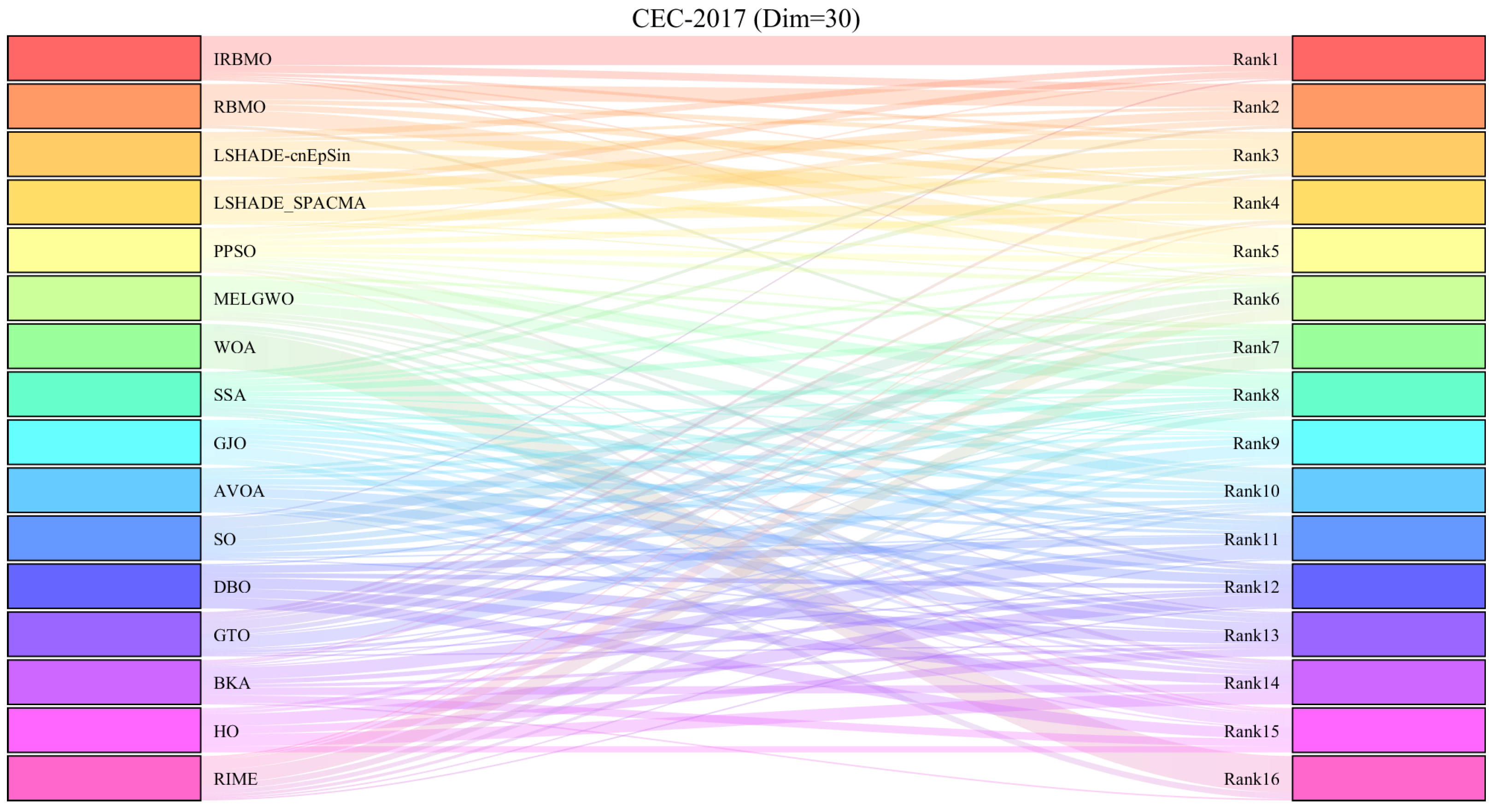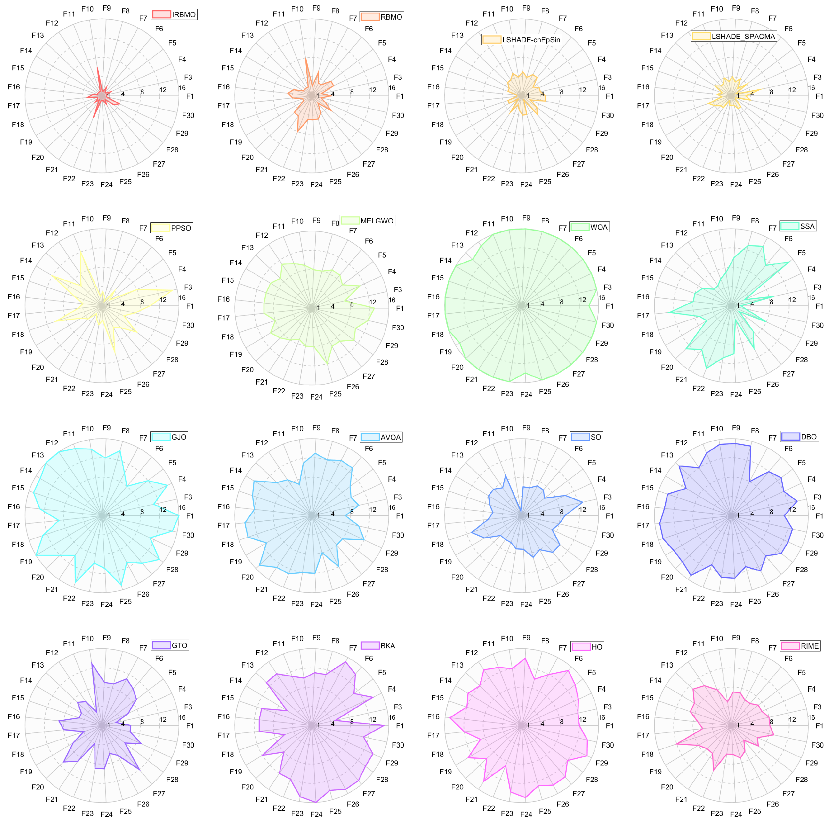 Comprehensive Benchmark Testing: The performance of 16 algorithms, including award-winning CEC competition algorithms, widely used algorithms or their improved versions, recently proposed high-performance and highly cited algorithms, as well as the classical RBMO and the proposed IRBMO, is compared on the CEC-2017 test sets of 30, 50, and 100 dimensions and the CEC-2022 test sets of 10 and 20 dimensions. To evaluate the performance of the 16 algorithms, radar charts, heat maps, Sankey diagrams, stacked bar charts, and line charts were employed to visualize their rankings and Friedman mean ranks across various test sets. We employed the Wilcoxon rank-sum test to ascertain if IRBMO’s performance was statistically distinct from the other algorithms. Additionally, we generated box plots to visualize the performance stability of each method. The findings from the CEC test sets reveal that IRBMO surpassed the other 15 algorithms on a majority of test functions, highlighting its superior stability, robustness, effectiveness, and capacity to avoid local optima.