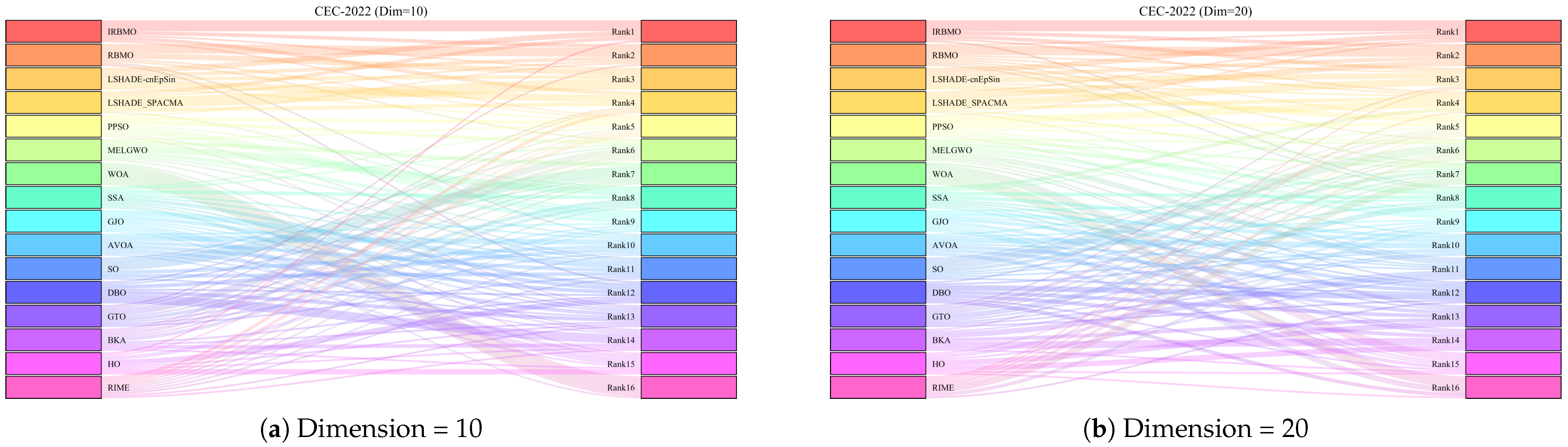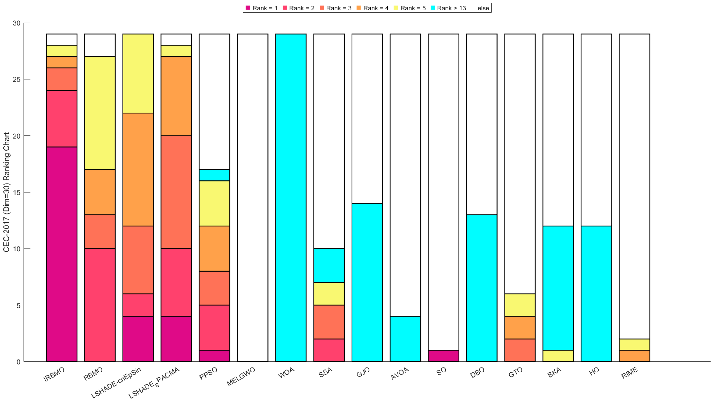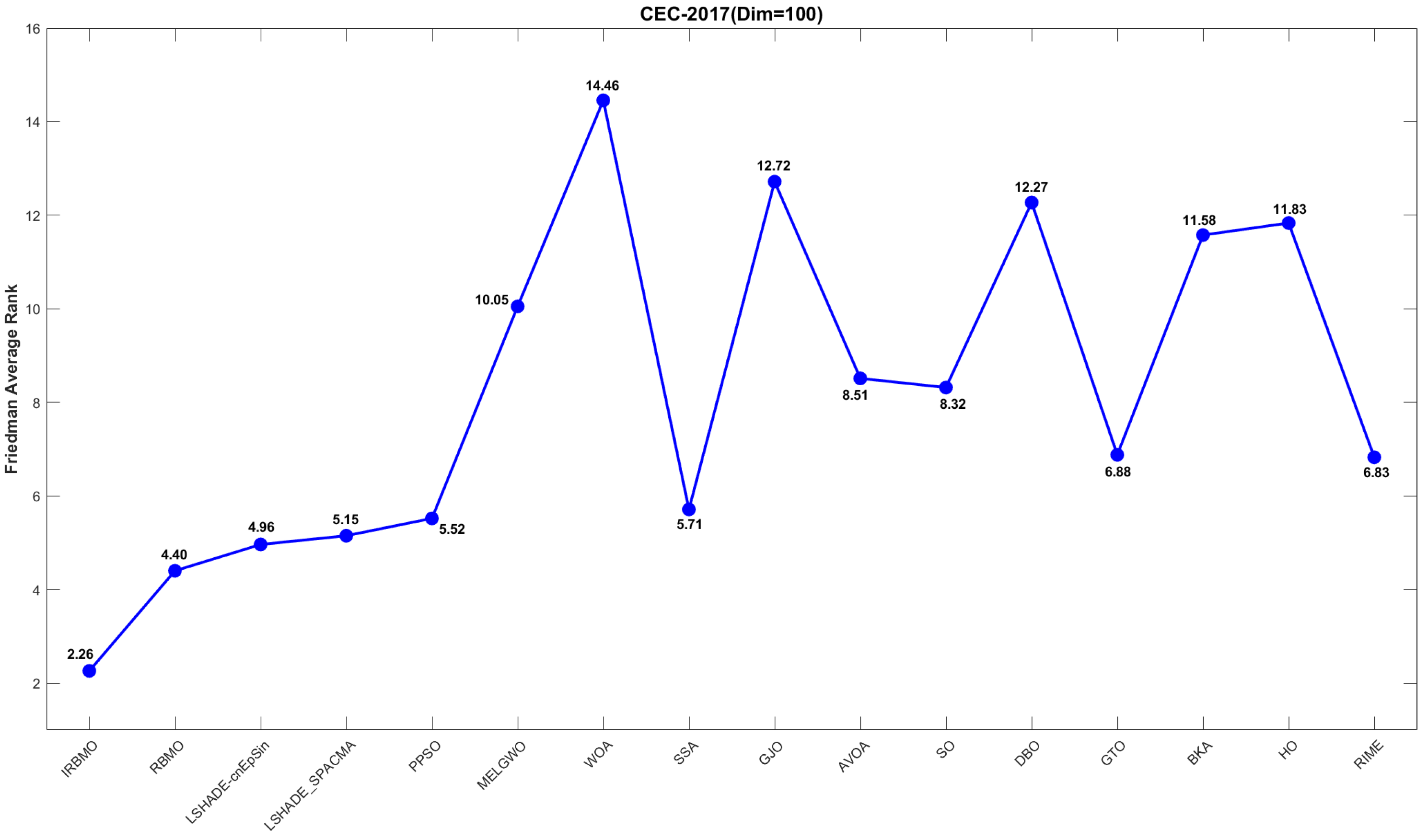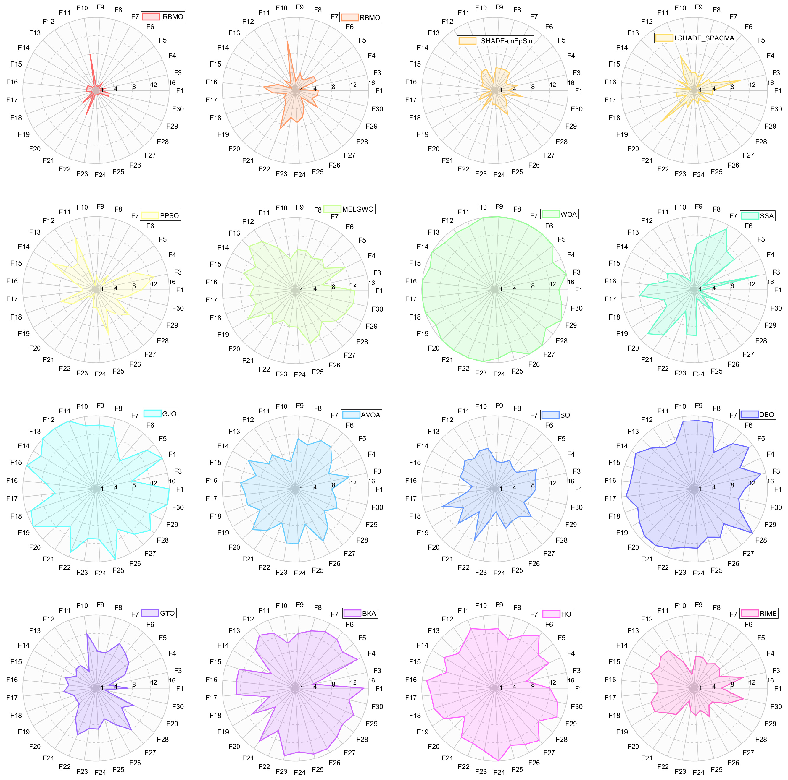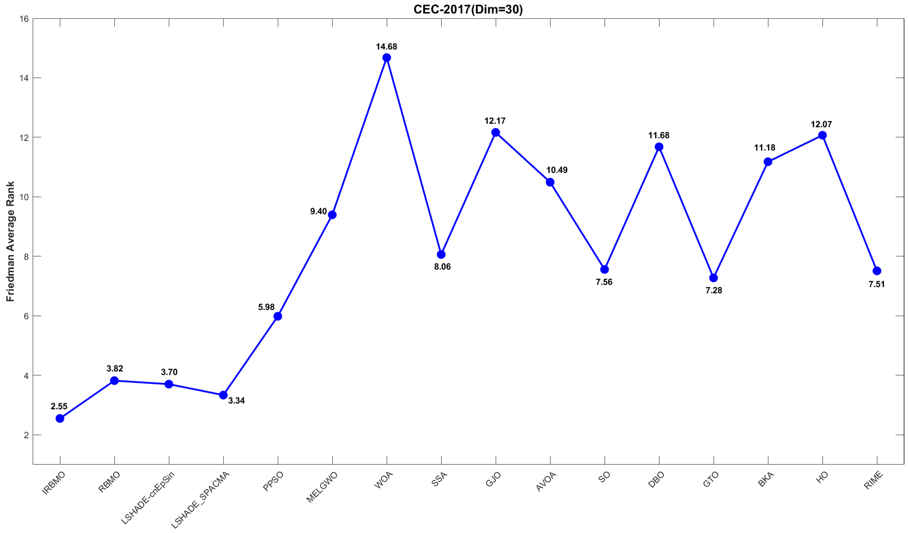 Comprehensive Benchmark Testing: The performance of 16 algorithms, including award-winning CEC competition algorithms, widely used algorithms or their improved versions, recently proposed high-performance and highly cited algorithms, as well as the classical RBMO and the proposed IRBMO, is compared on the CEC-2017 test sets of 30, 50, and 100 dimensions and the CEC-2022 test sets of 10 and 20 dimensions. To evaluate the performance of the 16 algorithms, radar charts, heat maps, Sankey diagrams, stacked bar charts, and line charts were employed to visualize their rankings and Friedman mean ranks across various test sets. We employed the Wilcoxon rank-sum test to ascertain if IRBMO’s performance was statistically distinct from the other algorithms. Additionally, we generated box plots to visualize the performance stability of each method. The findings from the CEC test sets reveal that IRBMO surpassed the other 15 algorithms on a majority of test functions, highlighting its superior stability, robustness, effectiveness, and capacity to avoid local optima.