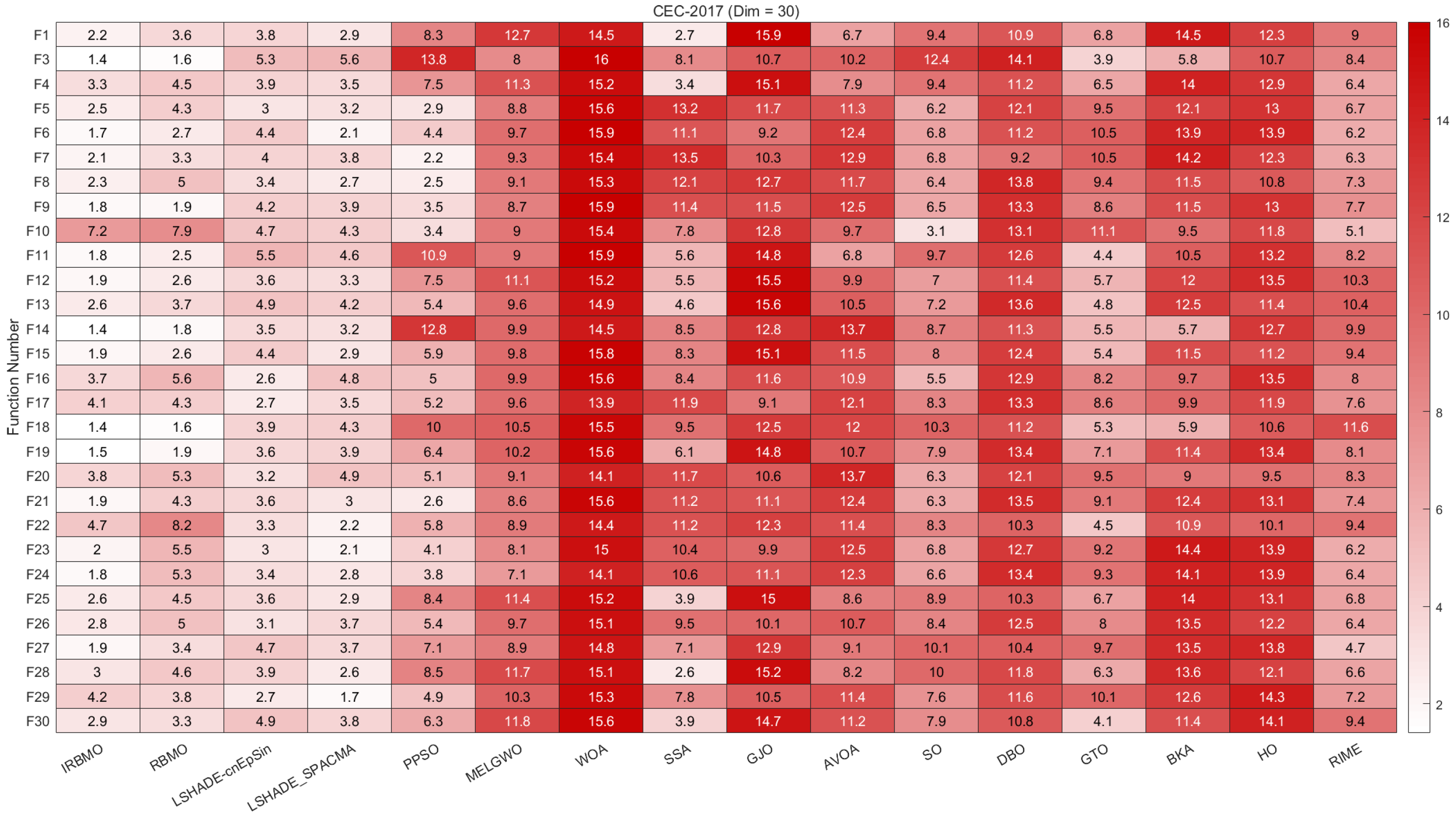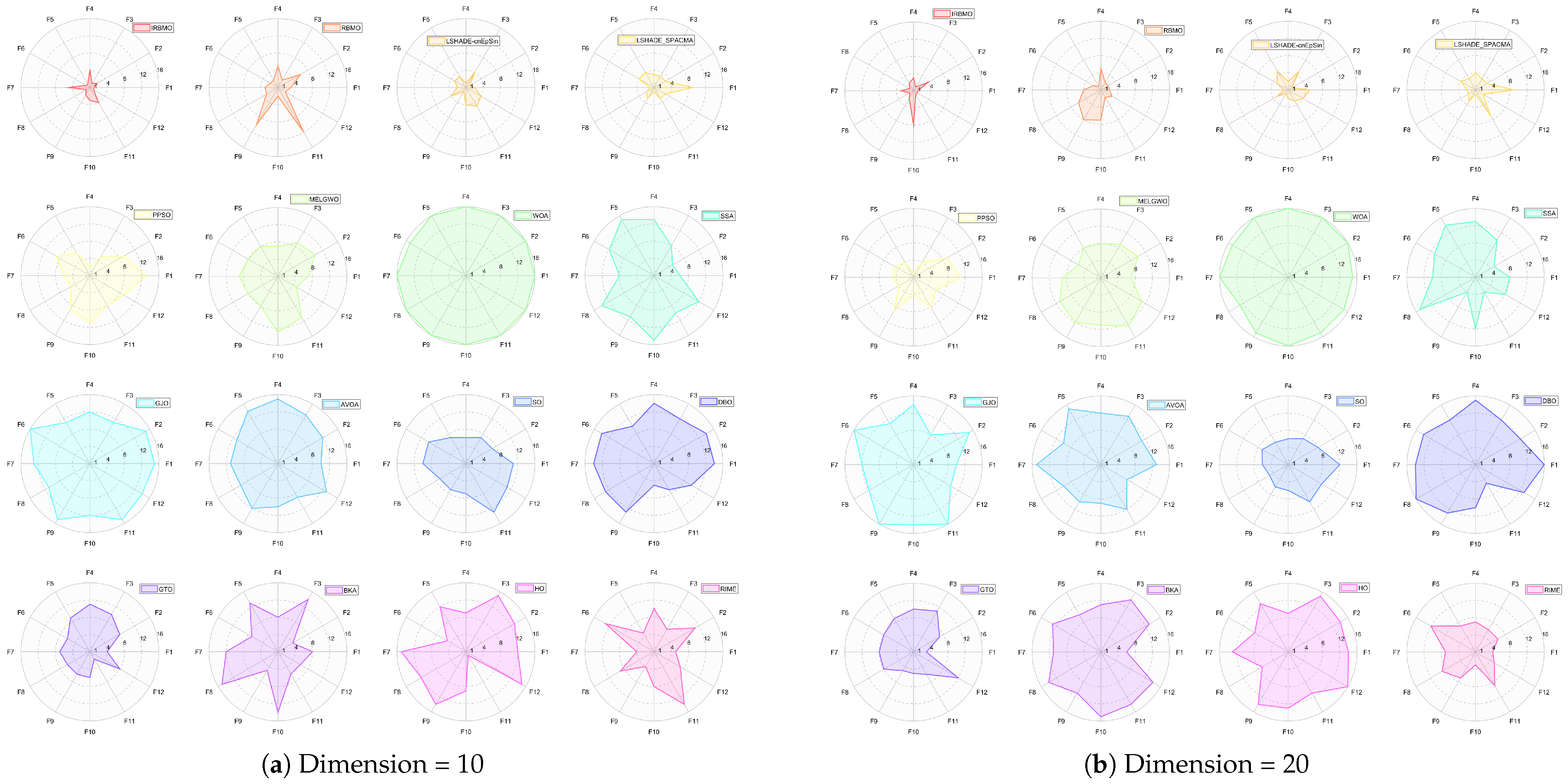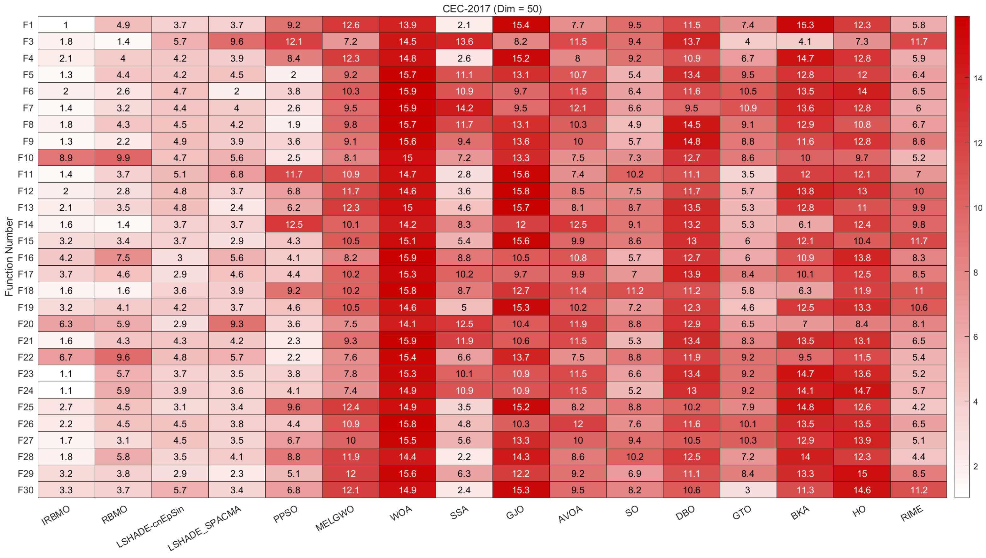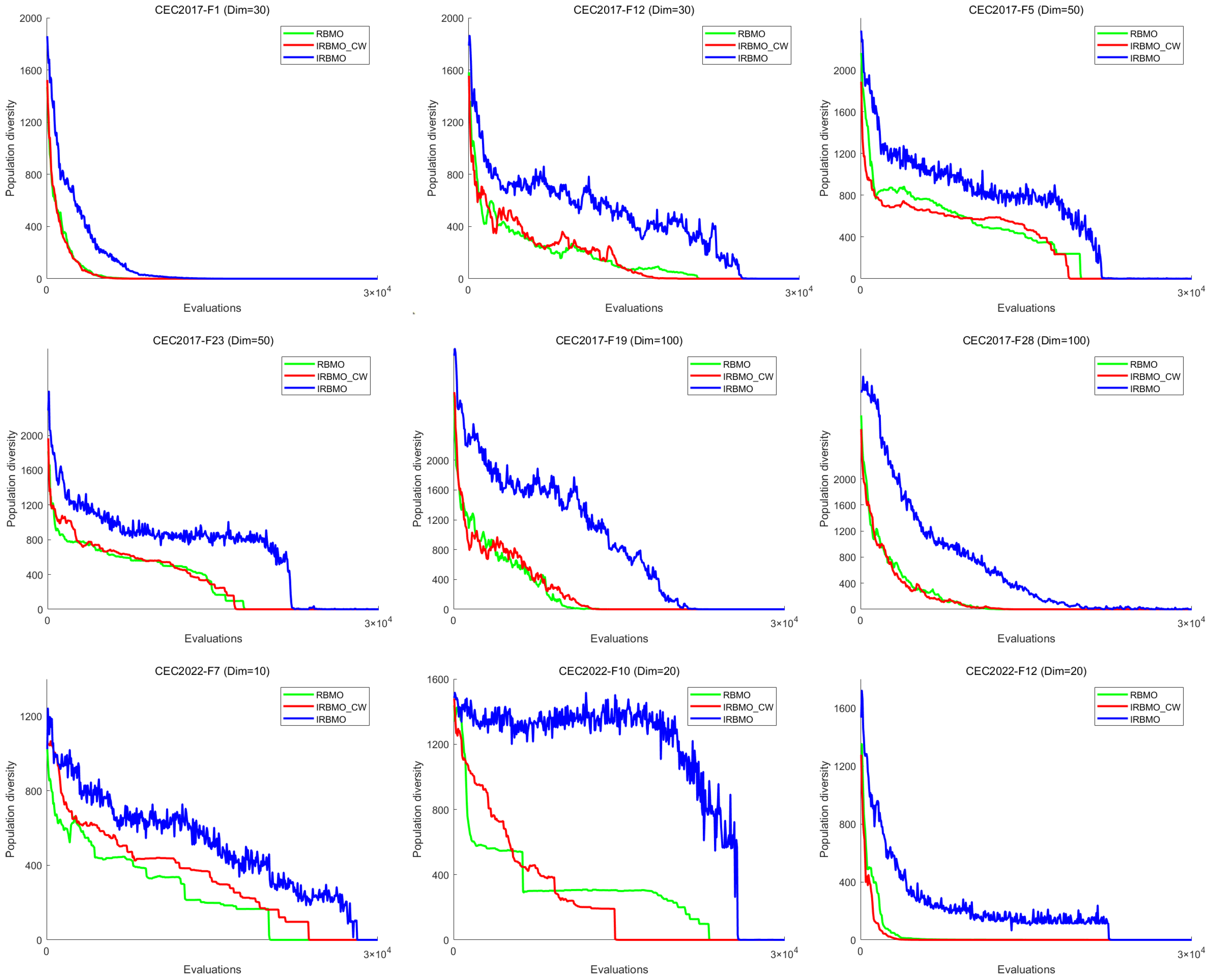 Comprehensive Benchmark Testing: The performance of 16 algorithms, including award-winning CEC competition algorithms, widely used algorithms or their improved versions, recently proposed high-performance and highly cited algorithms, as well as the classical RBMO and the proposed IRBMO, is compared on the CEC-2017 test sets of 30, 50, and 100 dimensions and the CEC-2022 test sets of 10 and 20 dimensions. To evaluate the performance of the 16 algorithms, radar charts, heat maps, Sankey diagrams, stacked bar charts, and line charts were employed to visualize their rankings and Friedman mean ranks across various test sets. We employed the Wilcoxon rank-sum test to ascertain if IRBMO’s performance was statistically distinct from the other algorithms. Additionally, we generated box plots to visualize the performance stability of each method. The findings from the CEC test sets reveal that IRBMO surpassed the other 15 algorithms on a majority of test functions, highlighting its superior stability, robustness, effectiveness, and capacity to avoid local optima.