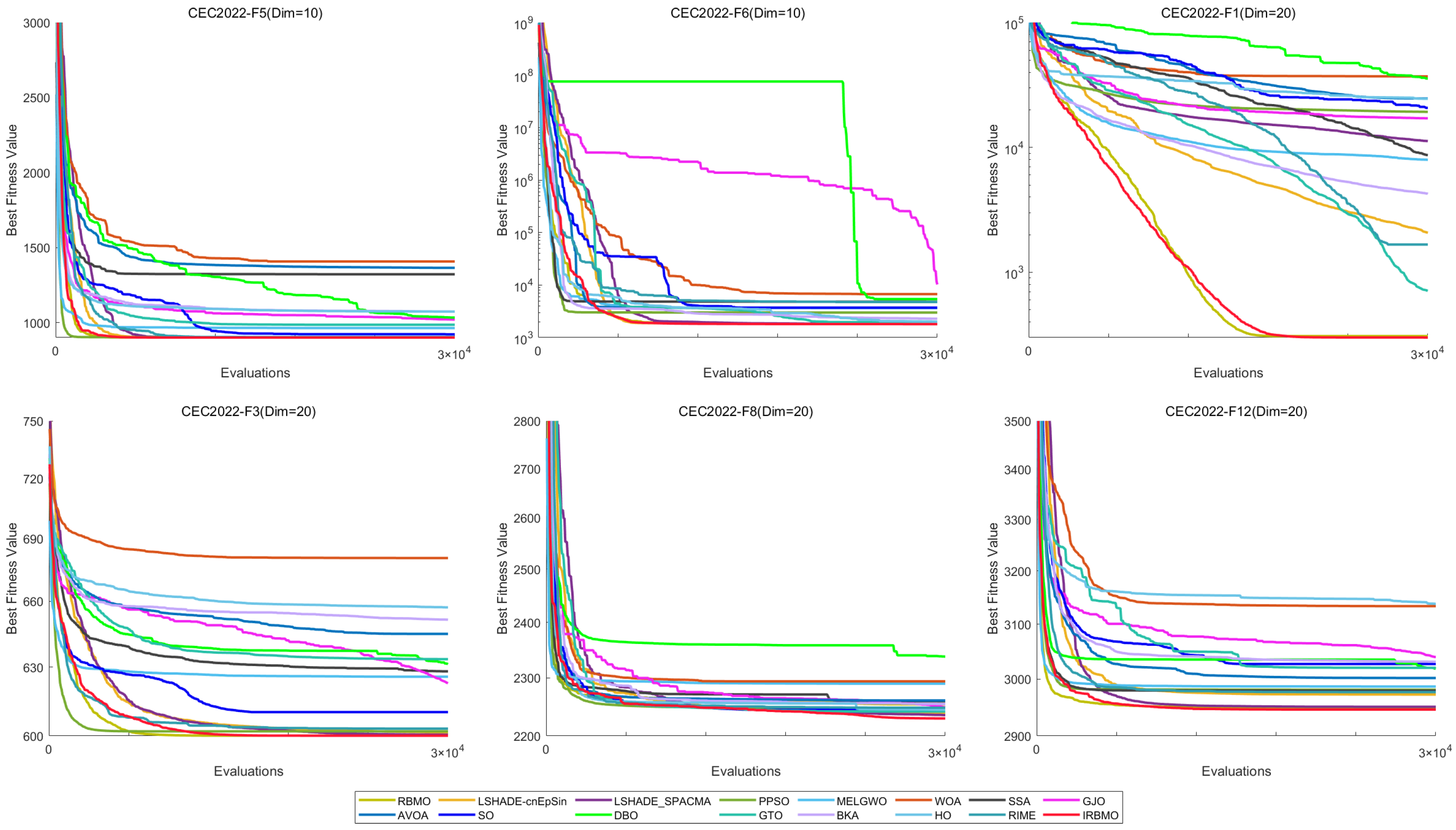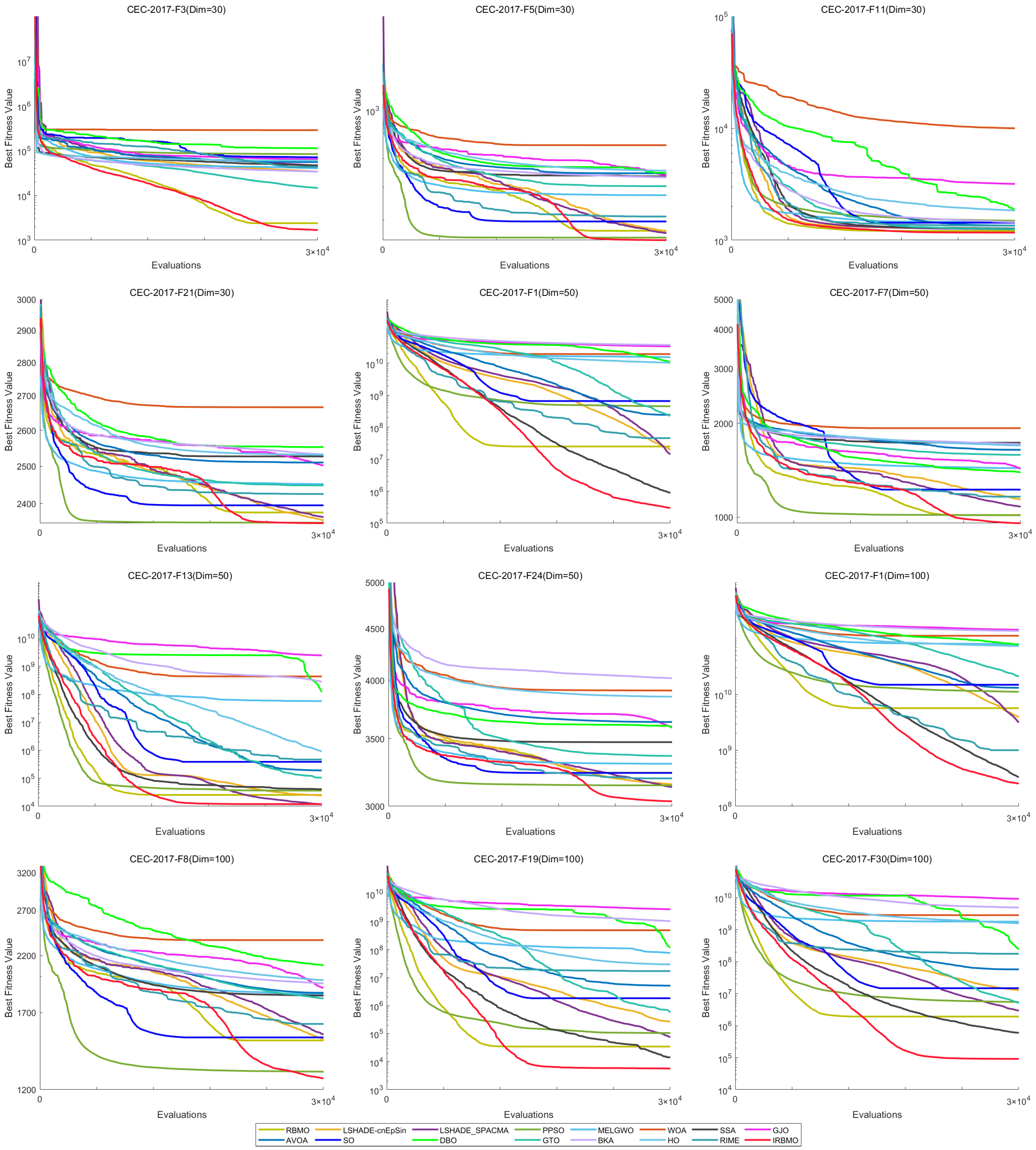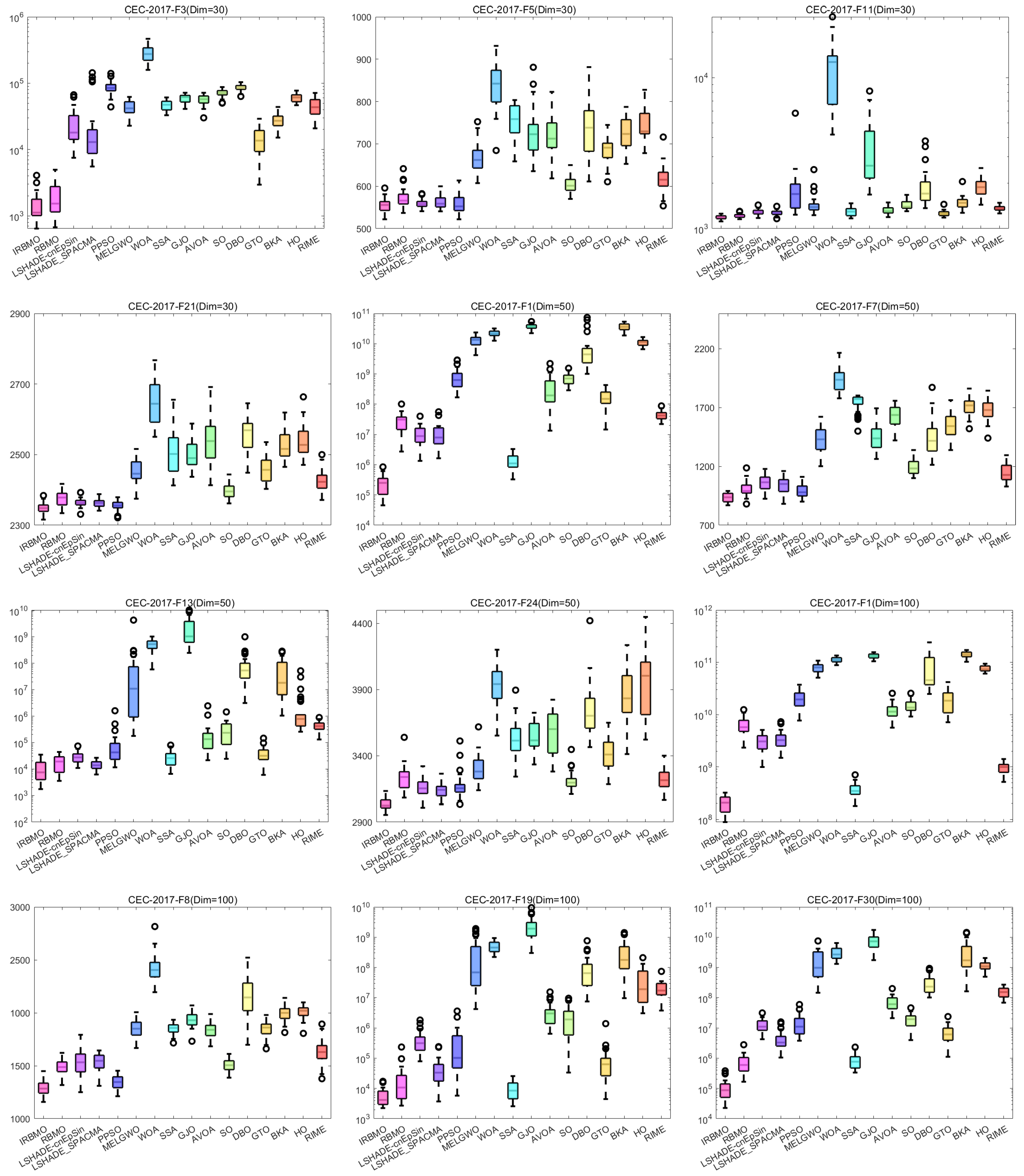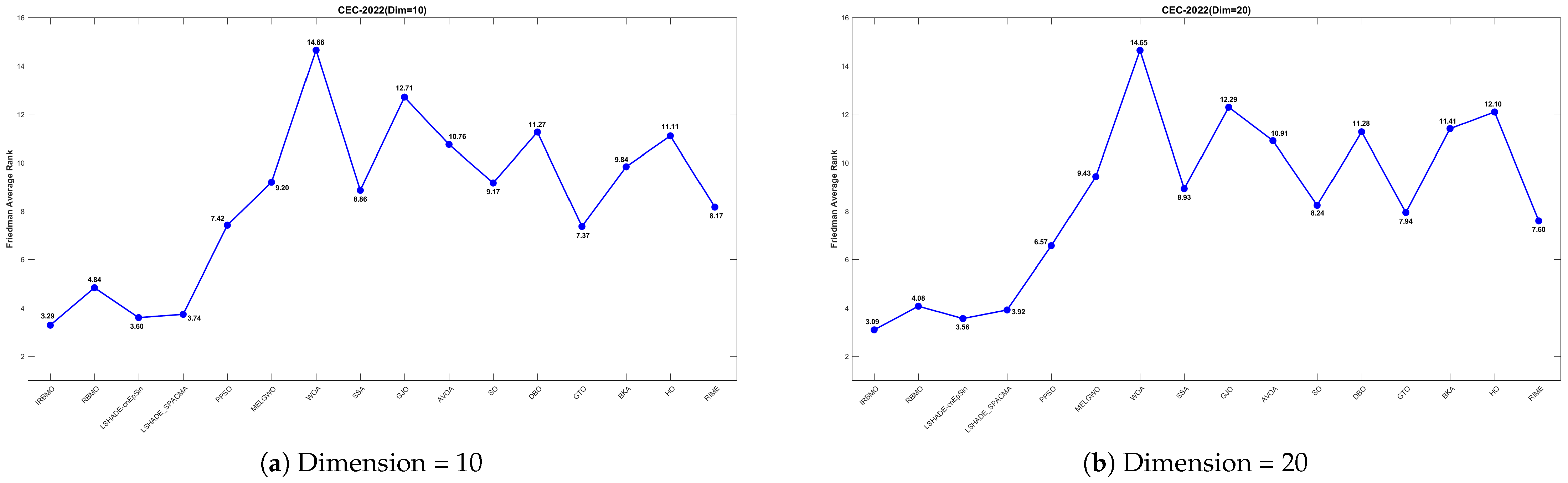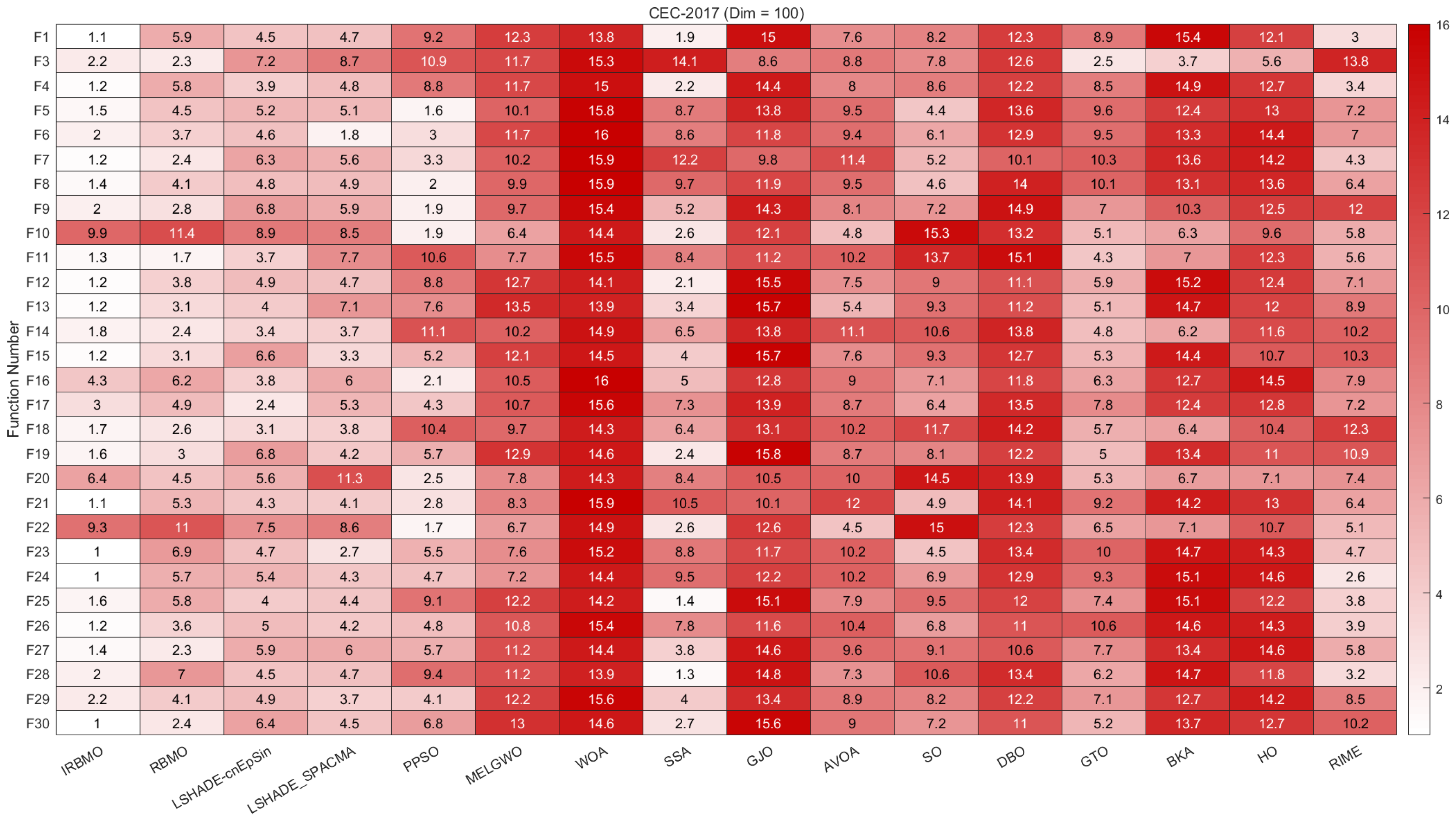 Comprehensive Benchmark Testing: The performance of 16 algorithms, including award-winning CEC competition algorithms, widely used algorithms or their improved versions, recently proposed high-performance and highly cited algorithms, as well as the classical RBMO and the proposed IRBMO, is compared on the CEC-2017 test sets of 30, 50, and 100 dimensions and the CEC-2022 test sets of 10 and 20 dimensions. To evaluate the performance of the 16 algorithms, radar charts, heat maps, Sankey diagrams, stacked bar charts, and line charts were employed to visualize their rankings and Friedman mean ranks across various test sets. We employed the Wilcoxon rank-sum test to ascertain if IRBMO’s performance was statistically distinct from the other algorithms. Additionally, we generated box plots to visualize the performance stability of each method. The findings from the CEC test sets reveal that IRBMO surpassed the other 15 algorithms on a majority of test functions, highlighting its superior stability, robustness, effectiveness, and capacity to avoid local optima.