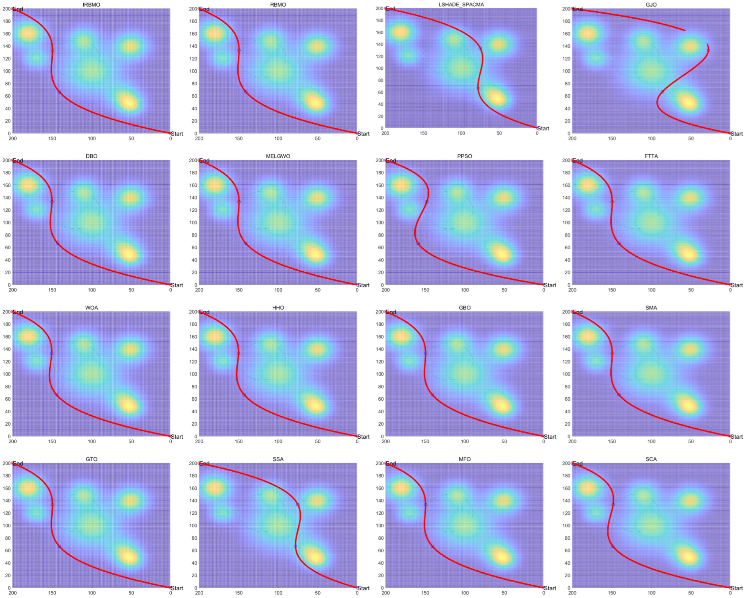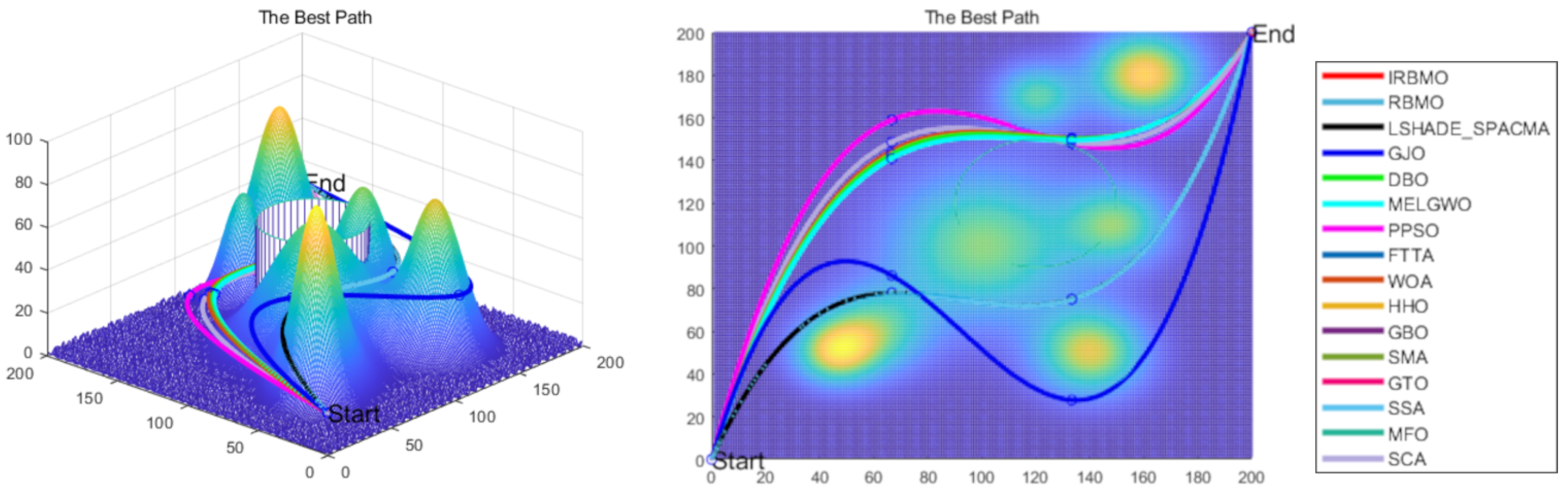 3D Path Planning for UAVs: IRBMO is applied to the 3D path planning problem for UAVs, and its performance is compared against 15 algorithms. Results validate IRBMO’s competitive edge and suitability for tackling 3D path planning problems relative to other state-of-the-art algorithms.