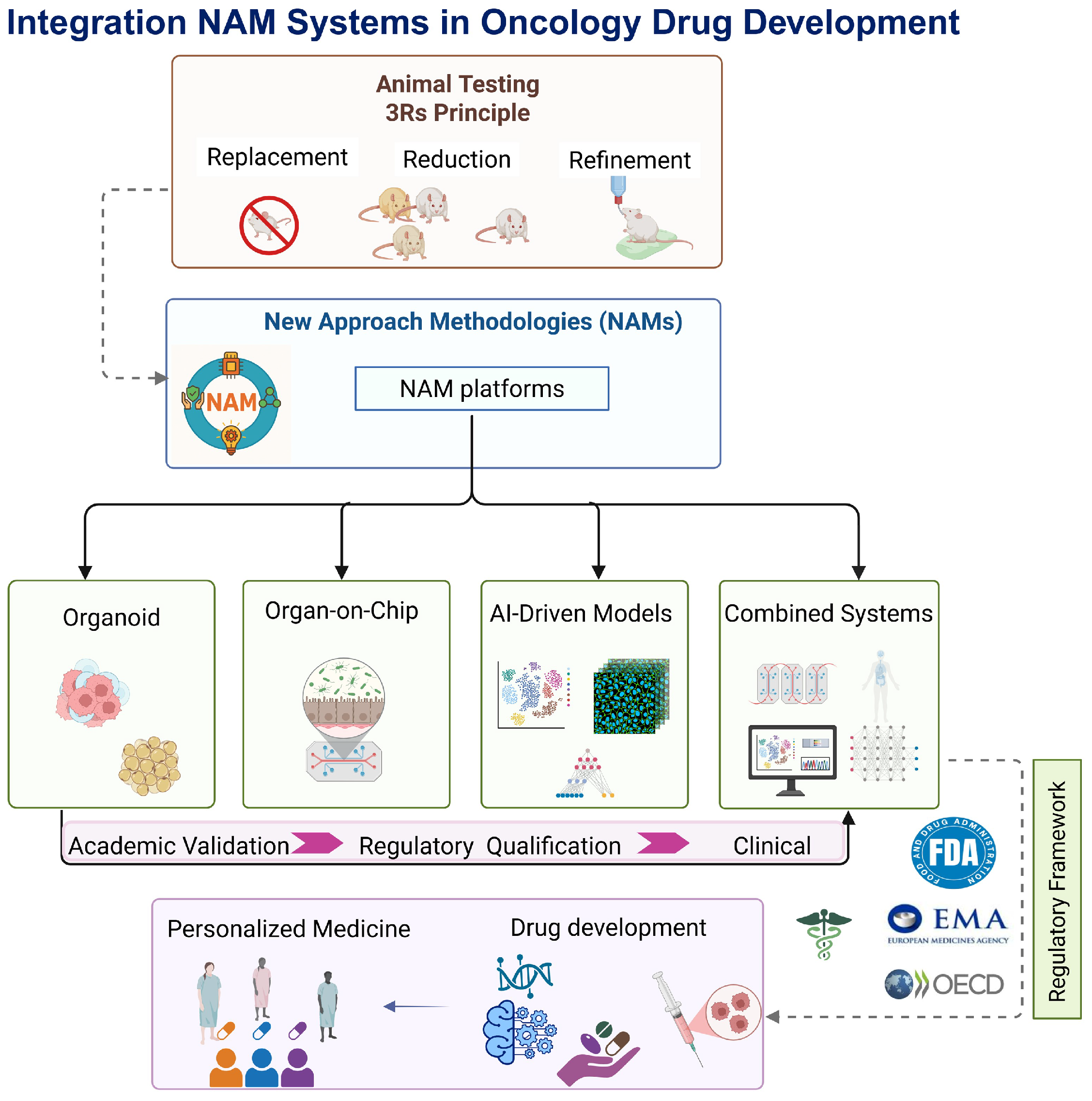 A variety of NAMs, including patient-derived organoids, organ-on-chip systems, and AI-driven models, provide robust, human-relevant alternatives to traditional animal-based oncology models. The ability to reproduce tumor complexity more accurately can lead to improved translational predictability, more customized strategies, and a reduction in attrition in clinical trials. A number of regulatory advances are paving the way for their adoption, including the FDA Modernization Act 2.0 and the EMA qualification framework. It will be essential to overcome challenges in standardization, reproducibility, and context-of-use validation. NAM integration could lead to faster, more accurate, and ethically aligned oncology drug development, ultimately leading to safer and more effective cancer therapies.