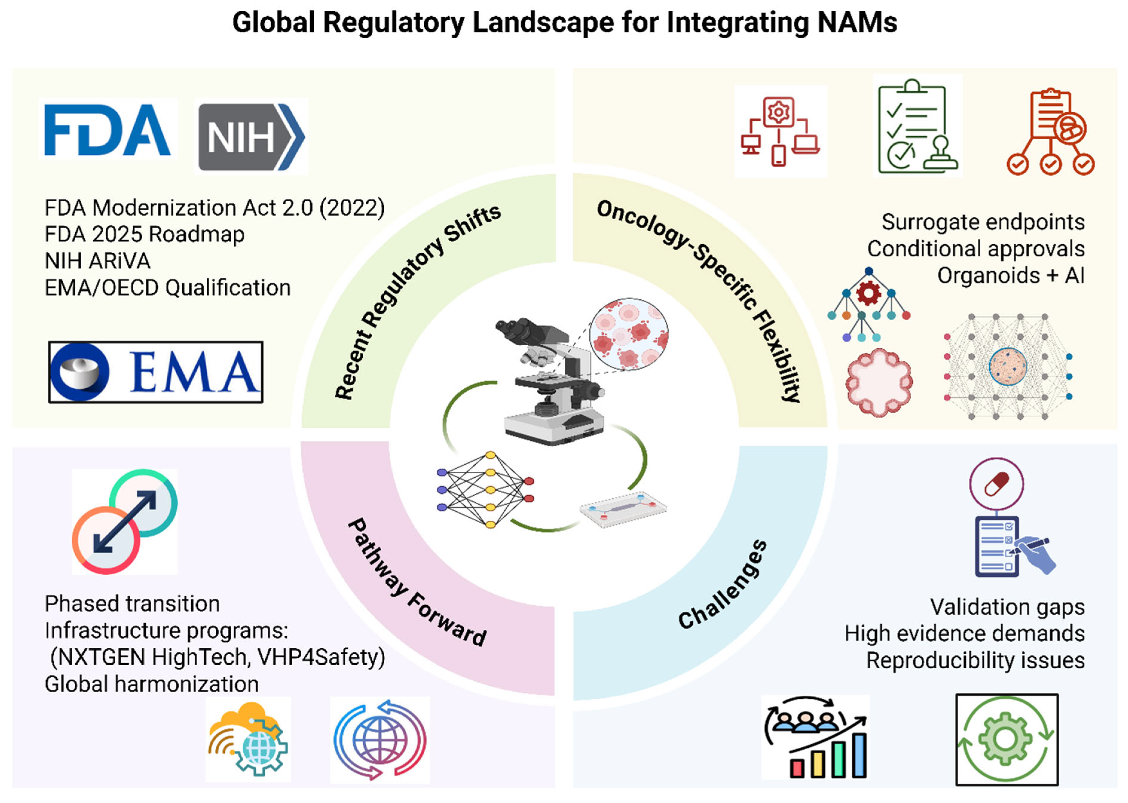Figure 2. Regulatory and policy context for integrating NAMs in oncology drug development, emphasizing recent regulatory shifts, oncology-specific flexibility, key challenges, and future harmonization efforts. Created with BioRender.com (https://BioRender.com/i6obo02 (accessed on 14 September 2025)).