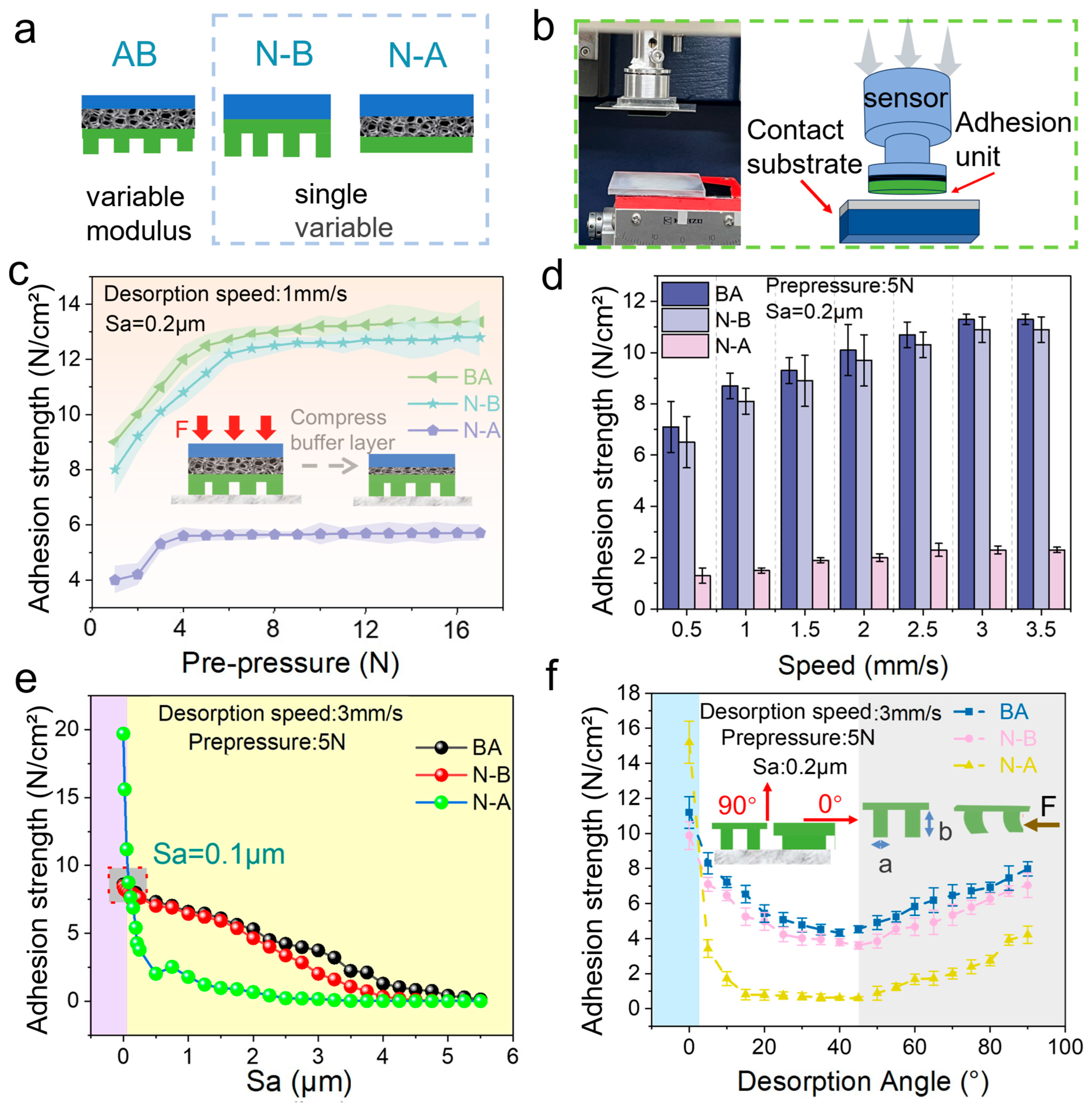 Figure 2. (a) Samples with buffer layer and microstructure layer (AB), samples with buffer layer and microstructure layer (N-B), and samples with buffer layer and no microstructure layer (N-A); (b) physical drawings and schematic diagrams of the experimental apparatus for testing biomimetic adhesive materials; (c) adhesion of the sample under different pre-pressures; (d) adhesion of the sample at different detachment speeds; (e) adhesion of the sample on substrates with different roughness; (f) adhesion of the sample at different angles, with insets showing the detachment direction and pillar height.