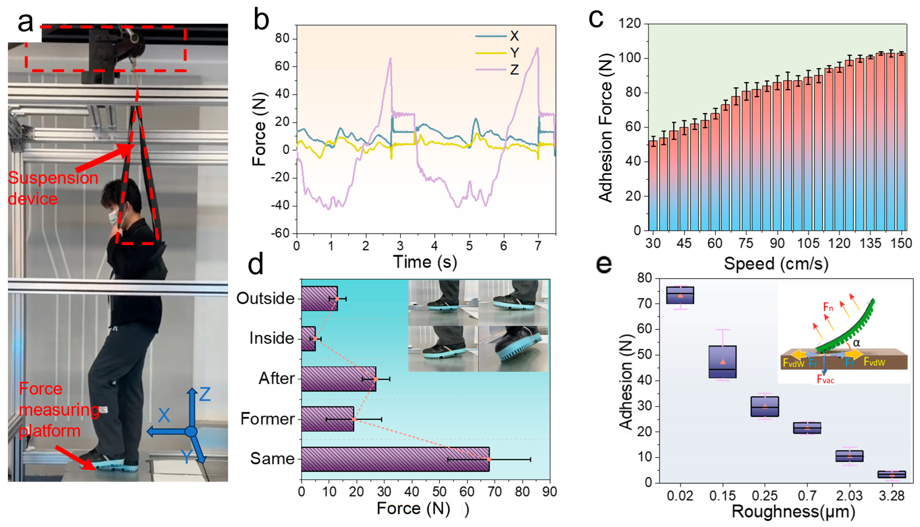 Figure 3. (a) Attitude diagram of the subject under the force measurement platform simulating a microgravity environment; (b) FX, FY, and FZ process data diagrams collected by the three-dimensional force measurement platform in the microgravity environment; (c) variation in adhesion of biomimetic adhesive shoes with different detachment speeds; (d) adhesion of the forefoot mode, hind heel mode, medial adhesion–detachment mode, and lateral detachment mode in microgravity, and the inset shows different detachment behavior patterns; (e) variation in the adhesion of biomimetic adhesive shoes under different roughness surfaces, and the inset shows a schematic diagram of microscopic detachment. A short demonstration of the suspension-based stepping tasks under the BA, N-A, and No-shoe conditions is provided in Video S1 (Supplementary Materials).