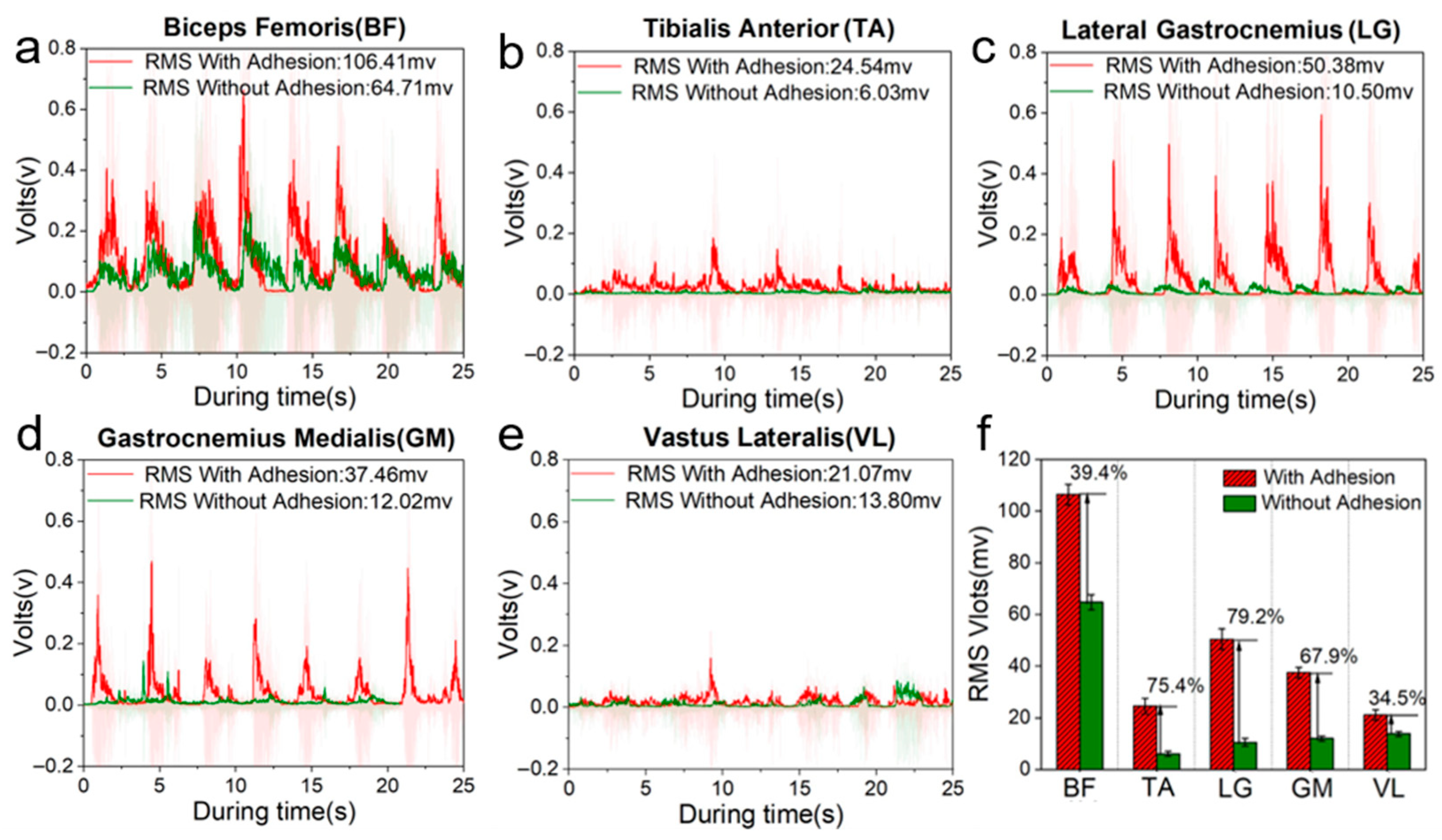Figure 5. (ae) Root mean squared results of the biceps femoris muscle, tibialis anterior, peroneal lateralis muscle, peroneal medialis, and vastus lateralis muscle in a microgravity environment, with the raw EMG data showing shades; (f) root mean squared average value of EMG leg lifting movements in subjects with (red) and without (green) biomimetic adhesive shoes in a microgravity environment.