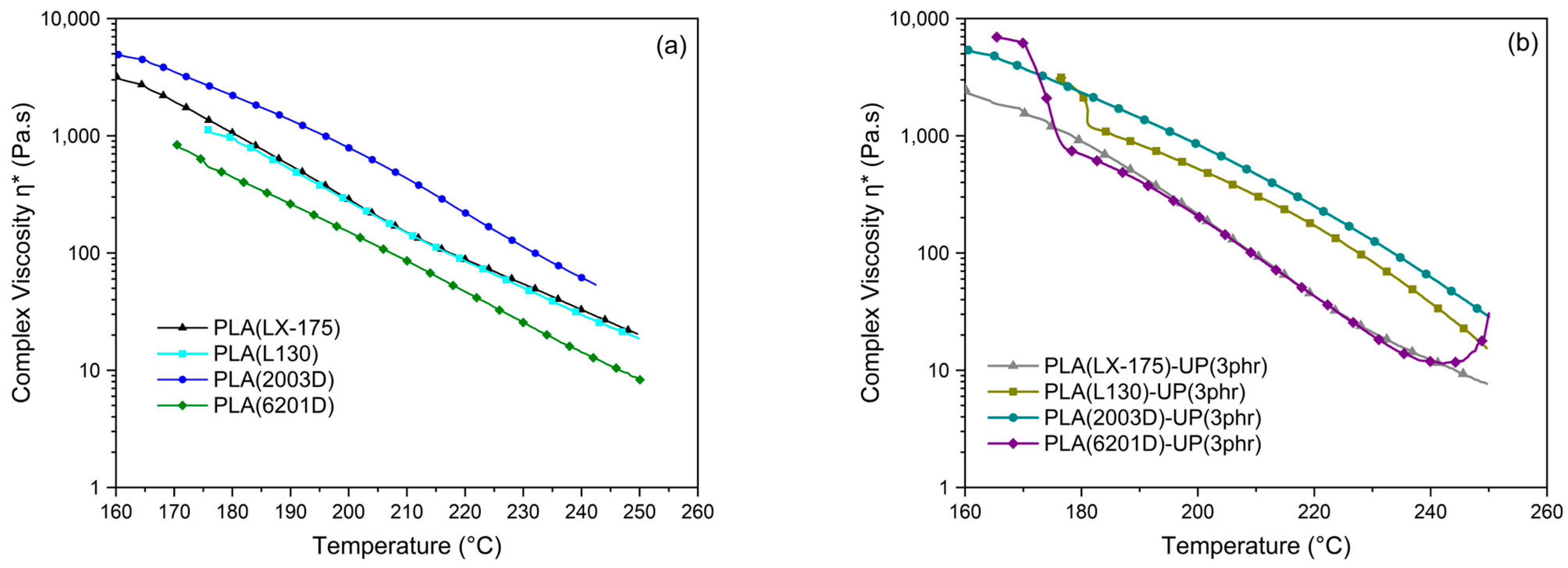 - Atalay, S.E.; Bezci, B.; Özdemir, B.; Göksu, Y.A.; Ghanbari, A.; Jalali, A.; Nofar, M. Thermal and environmentally induced degradation behaviors of amorphous and semicrystalline PLAs through rheological analysis. J. Polym. Environ. 2021, 29, 3412–3426. [Google Scholar] [CrossRef]