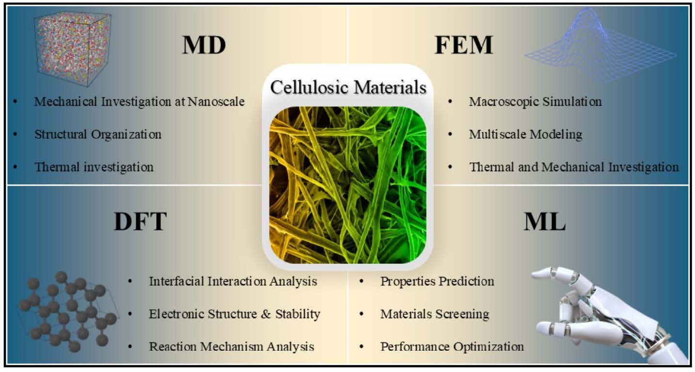 This review has outlined the most common simulation and computational techniques used for cellulosic materials, including DFT, MD, FEM, and ML. As discussed and illustrated throughout, we aimed to highlight the applications spanning the atomic to mesoscale in a comprehensive manner.