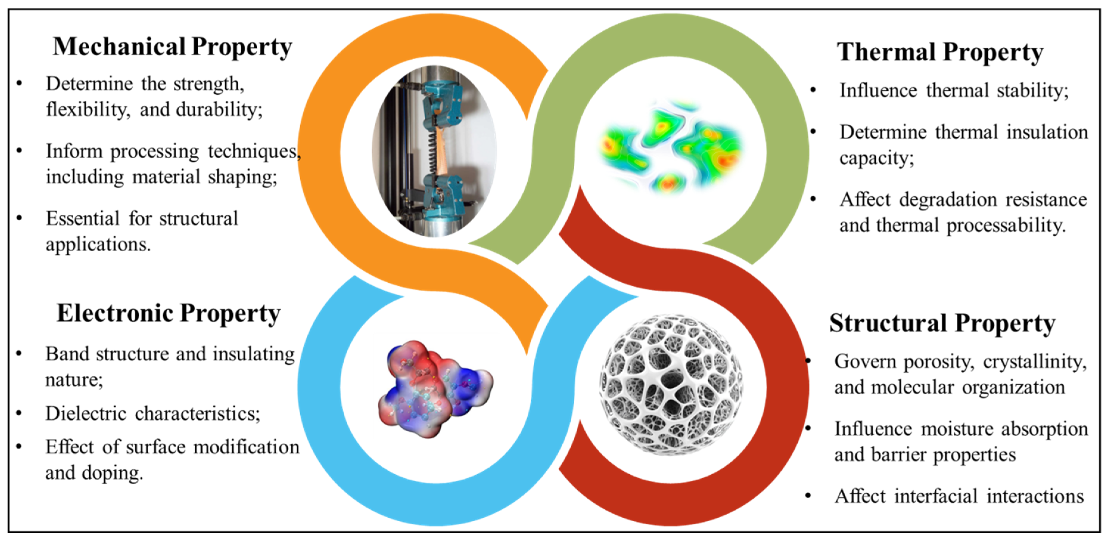 54]. At larger scales, coarse-grained (CG) modeling, continuum-based finite element analysis (FEA), and other macroscopic approaches become necessary to describe the mechanical behavior and interactions of larger structural features. To provide a comprehensive overview, these computational techniques are discussed in detail, along with their specific applications in property prediction and analysis. Key properties, including mechanical, thermal, structural, optical, electronic, and catalytic characteristics, have been investigated by these methods.