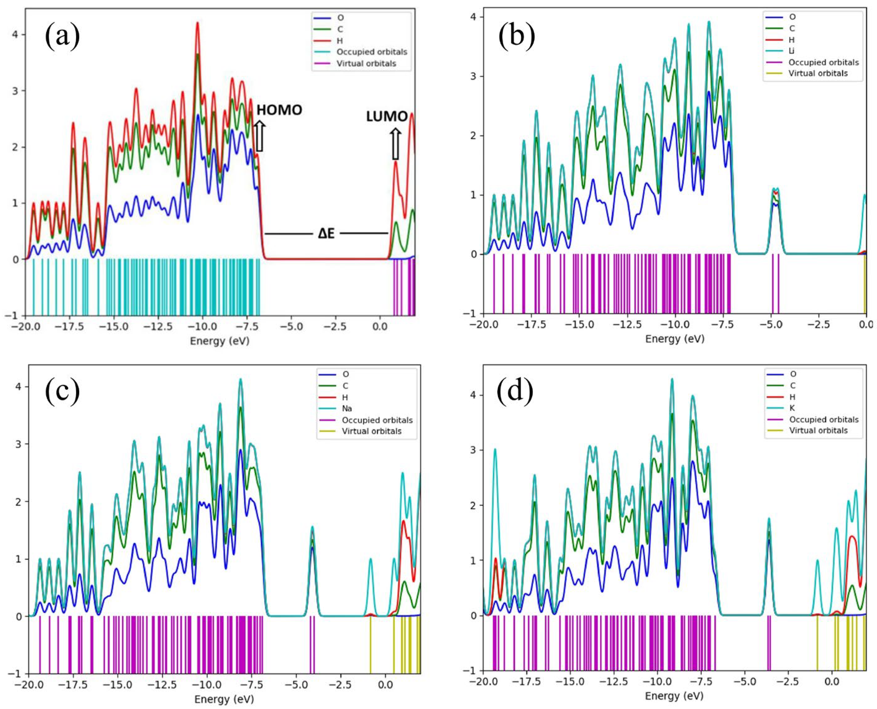 Figure 14a–d). They applied the B3LYP/6-311G(d,p) level of theory to compute pristine and alkali-modified cellulose chains, studying changes in molecular orbital levels, band gaps, and electrostatic potential distributions. Their findings revealed significant reductions in the HOMO–LUMO band gap due to the incorporation of alkali metals, from 4.89 eV in pristine cellulose to as low as 2.47 eV in hydrated K-doped cellulose, indicating increased electronic activity. Projected density of states (PDOS) analysis revealed new orbital contributions near the Fermi level from the metal atoms, along with enhanced charge delocalization across the energy spectrum involving both metal and carbon atoms.