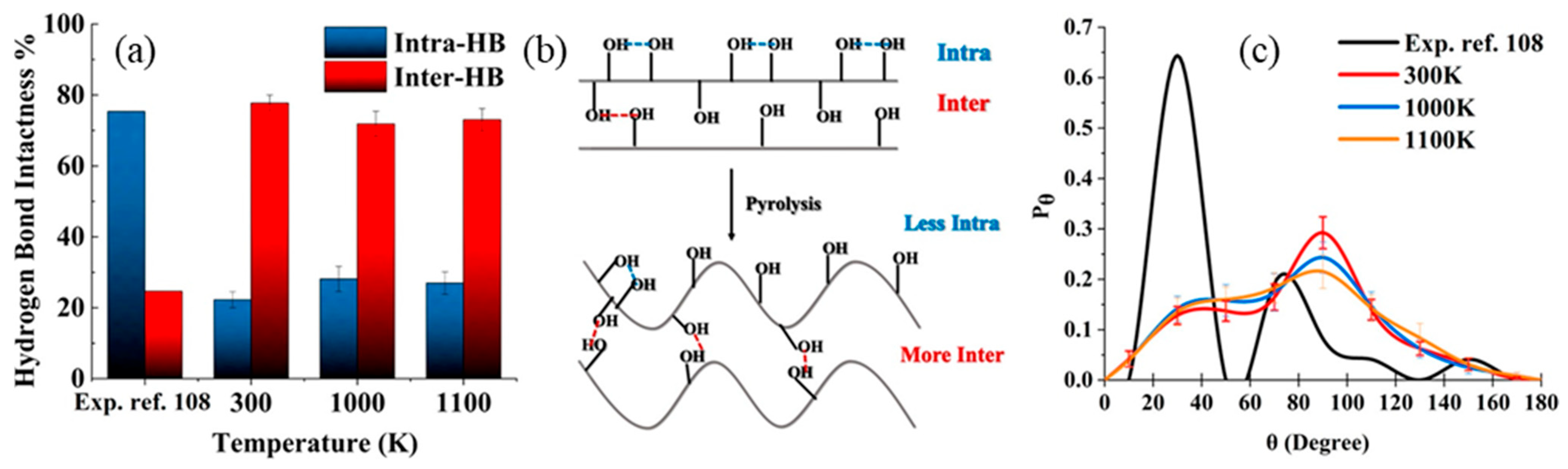 157] utilized reactive MD (ReaxFF) simulations to investigate the pyrolytic decomposition of crystalline cellulose under thermal treatment. Their study revealed how thermal activation disrupts the hydrogen-bond network, rearranges carbon–hydrogen–oxygen species, and reduces mechanical strength (