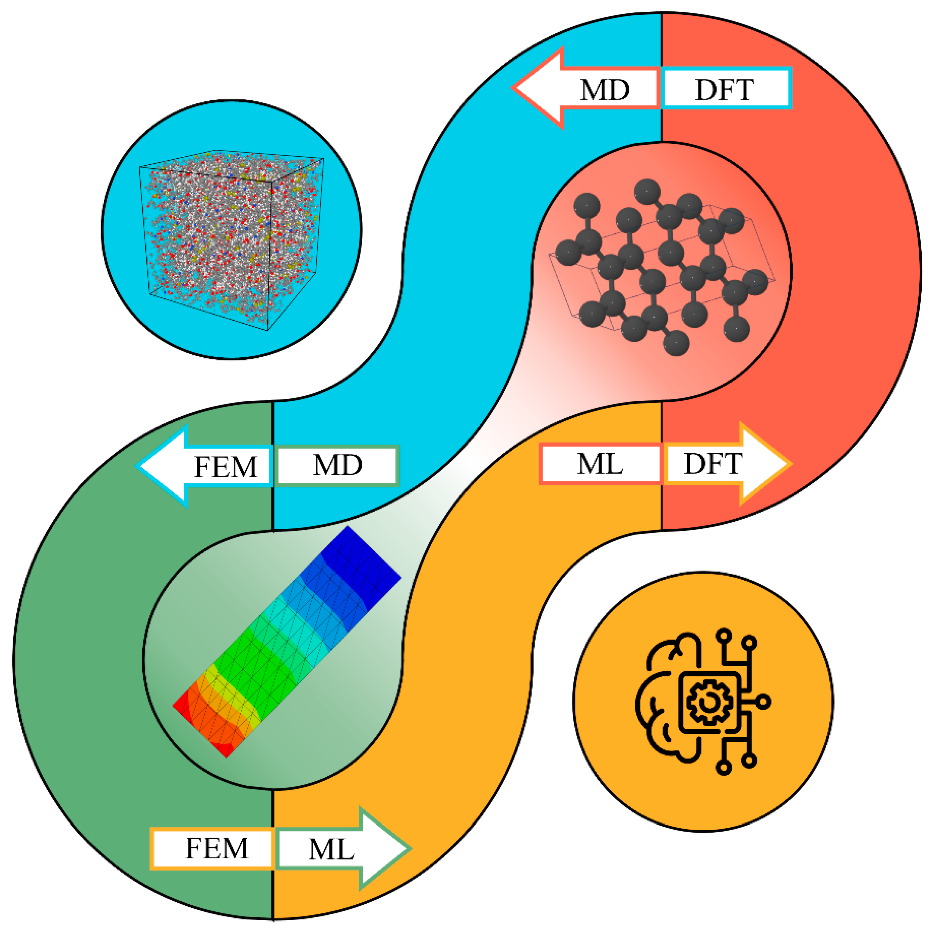 To clarify how information propagates across scales and how to bridge the gap between atomic-level mechanisms and macroscopic performance, an integrated pipeline can be established to create a learning loop that incorporates DFT, MD, FEM, and ML in a sequential and data-driven manner. In this framework, DFT calculations could be the first technique to be utilized for providing fundamental energetic and structural parameters at the atomic scale. These parameters will then be used as the input in MD simulations to model molecular interactions, dynamic behavior, and temperature-dependent responses. The obtained properties via MD, such as elastic modulus, diffusion coefficients, or relaxation times, are subsequently transferred into FEM models to evaluate the mechanical, thermal, or rheological performance at the component or structural scale. Finally, ML models will be trained on datasets generated across all three computational stages, which identify underlying structure–property relationships and enable a comprehensive fundamental understanding, rapid prediction, and optimization of desired systems. The entire process is illustrated in