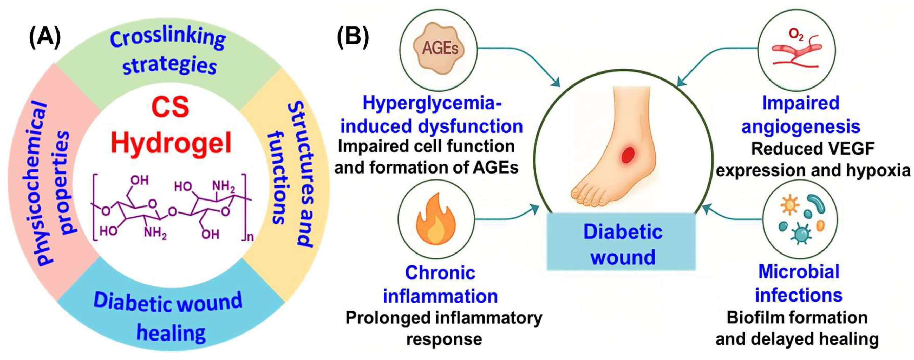 - Li, W. Applications of Chitosan-Based Hydrogels in Diabetic Wound Healing: A Review. Int. J. Biol. Macromol. 2025, 324, 147264. [Google Scholar] [CrossRef] [PubMed]
