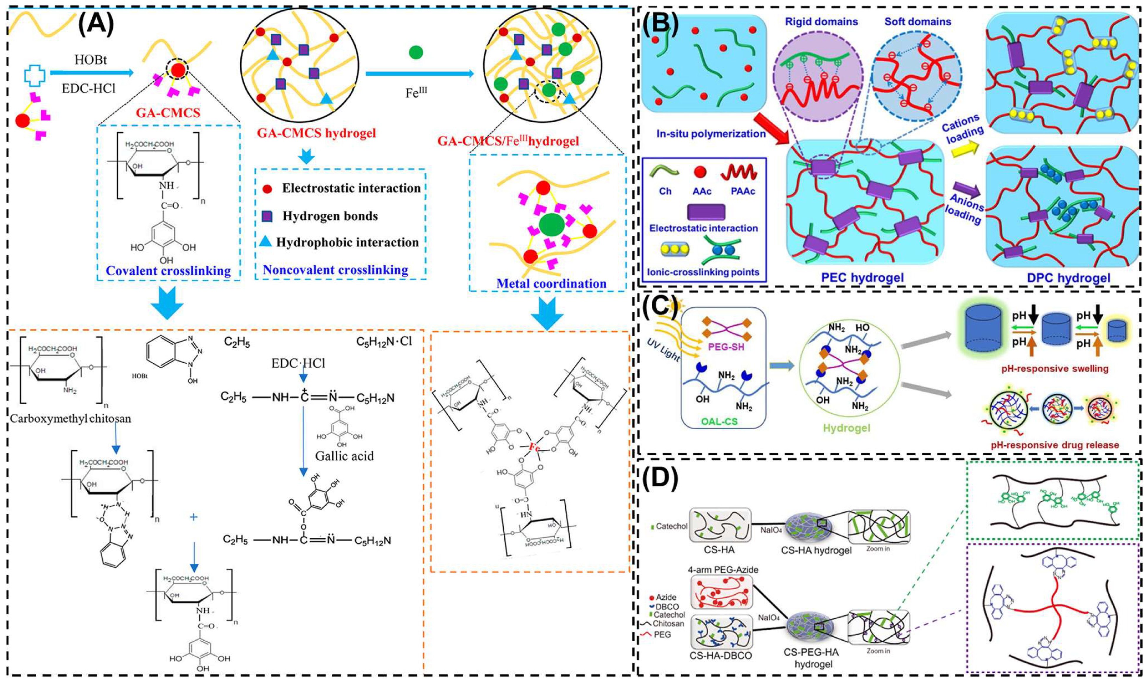 - Salahuddin, A.; Ashraf, A.; Ahmad, K.; Hou, H. Recent advances in chitosan-based smart hydrogel for drug delivery systems. Int. J. Biol. Macromol. 2024, 280, 135803. [Google Scholar] [CrossRef] [PubMed]