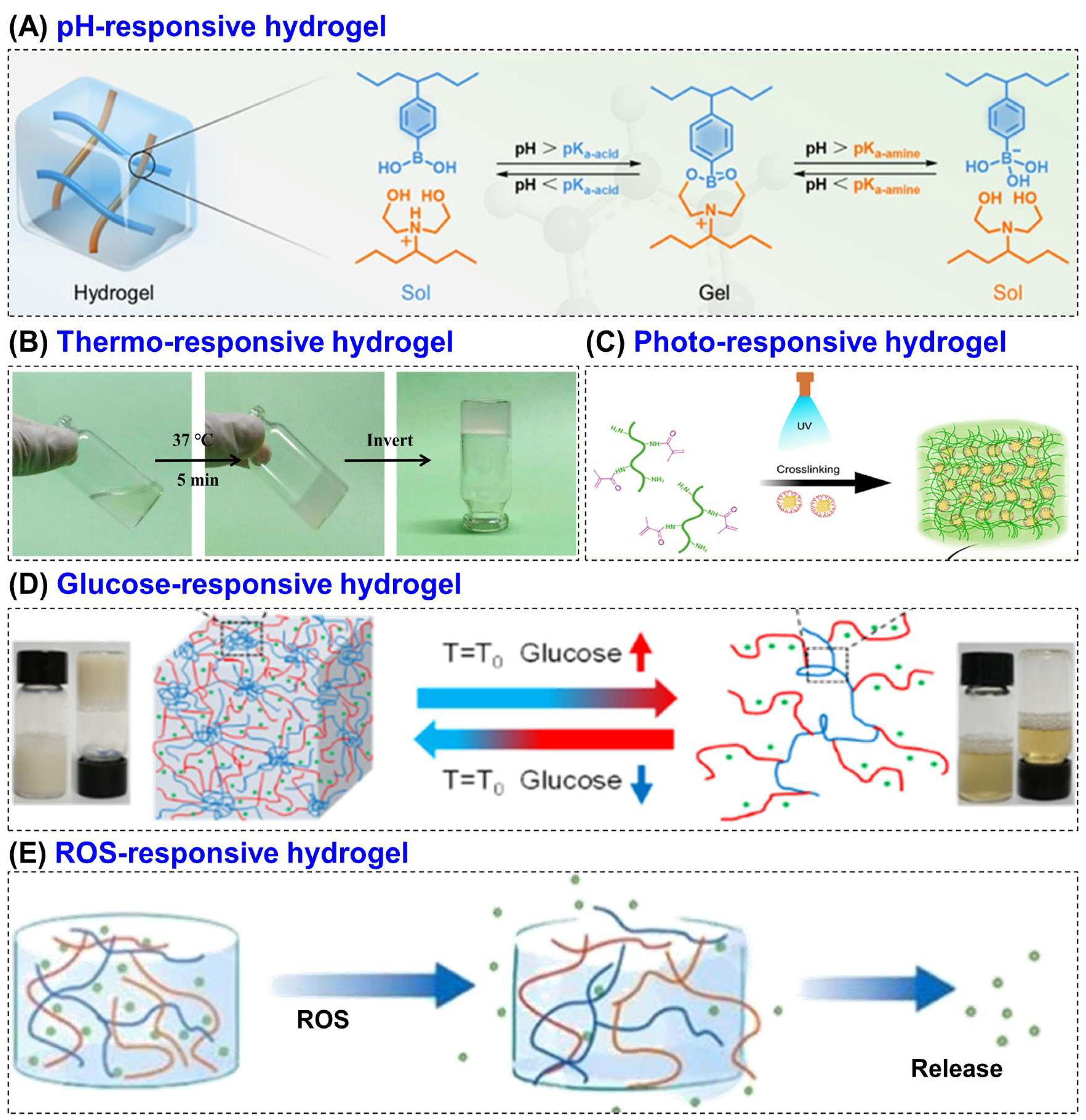 - Yu, H.; Gao, R.; Liu, Y.; Fu, L.; Zhou, J.; Li, L. Stimulus-Responsive Hydrogels as Drug Delivery Systems for Inflammation Targeted Therapy. Adv. Sci. 2024, 11, e2306152. [Google Scholar] [CrossRef] [PubMed]