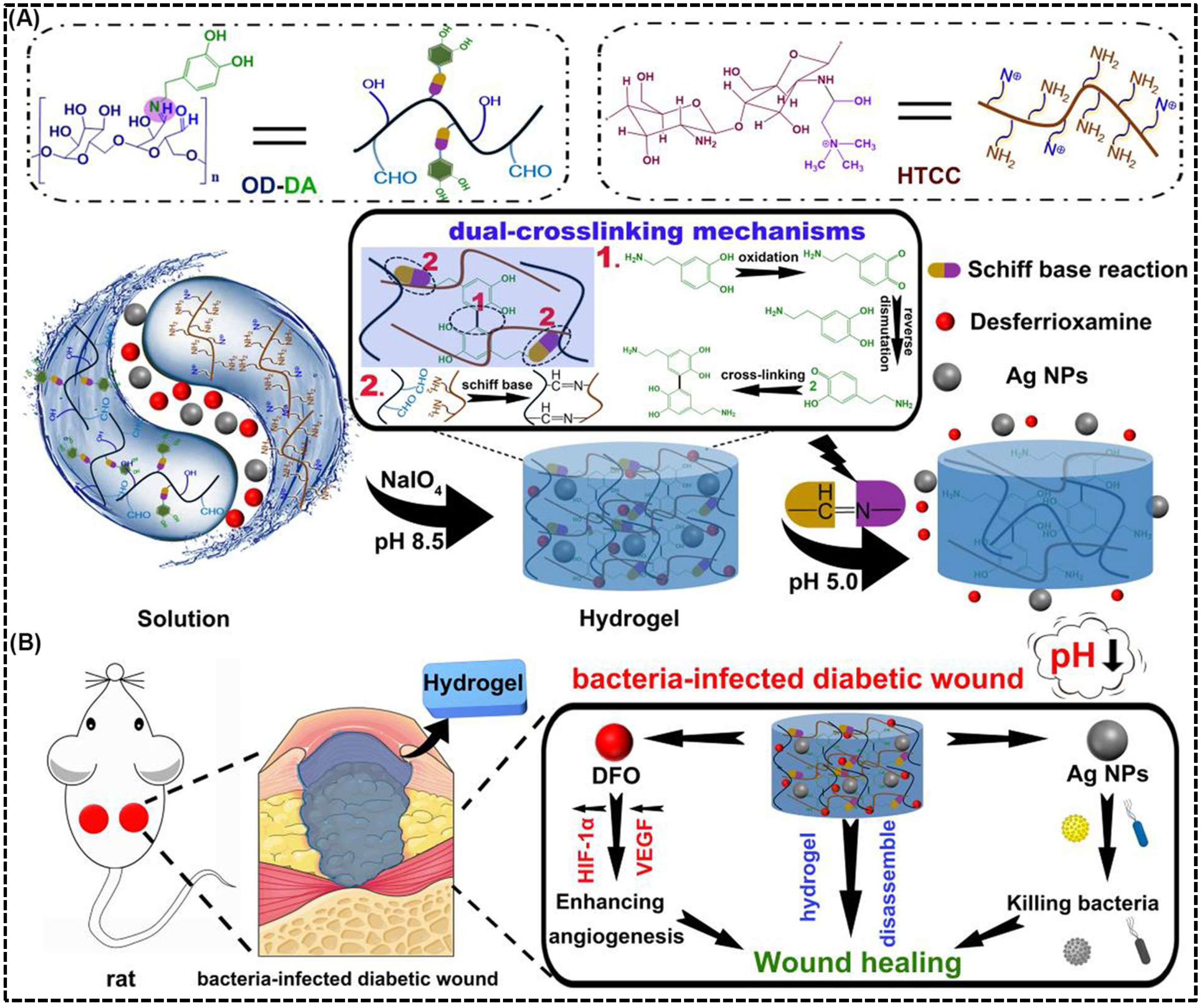 - Yang, Z.; Wang, C.; Zhang, Z.; Yu, F.; Wang, Y.; Ding, J.; Zhao, Z.; Liu, Y. A PH Responsive Tannic Acid/Quaternized Carboxymethyl Chitosan/Oxidized Sodium Alginate Hydrogels for Accelerated Diabetic Wound Healing and Real-Time Monitoring. Int. J. Biol. Macromol. 2024, 264, 130741. [Google Scholar] [CrossRef]