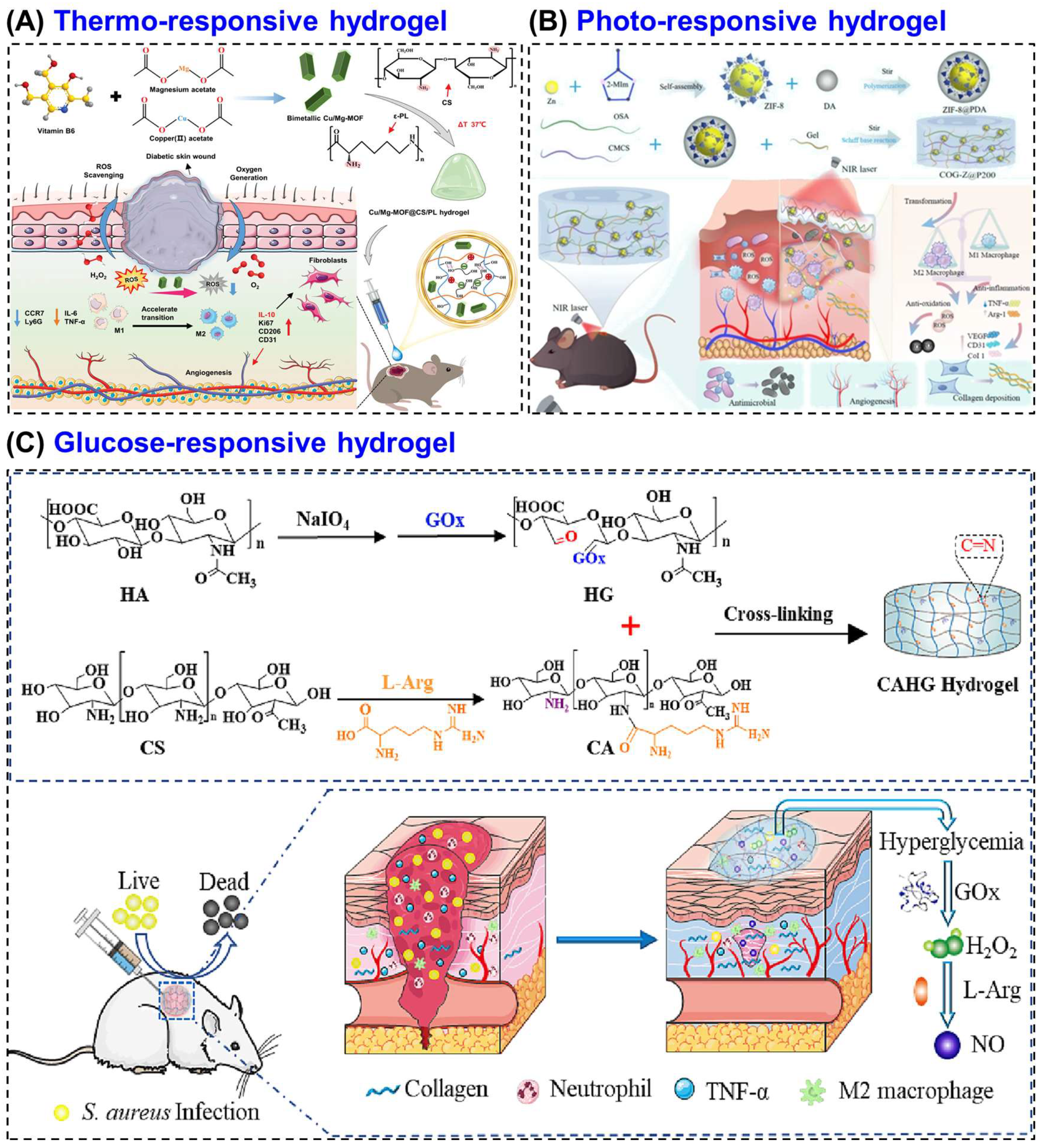 - Dai, F.; Zhang, J.; Chen, F.; Chen, X.; Lee, C.J.; Liang, H.; Zhao, L.; Tan, H. A Multi-Responsive Hydrogel Combined with Mild Heat Stimulation Promotes Diabetic Wound Healing by Regulating Inflammatory and Enhancing Angiogenesis. Adv. Sci. 2024, 11, e2408783. [Google Scholar] [CrossRef]