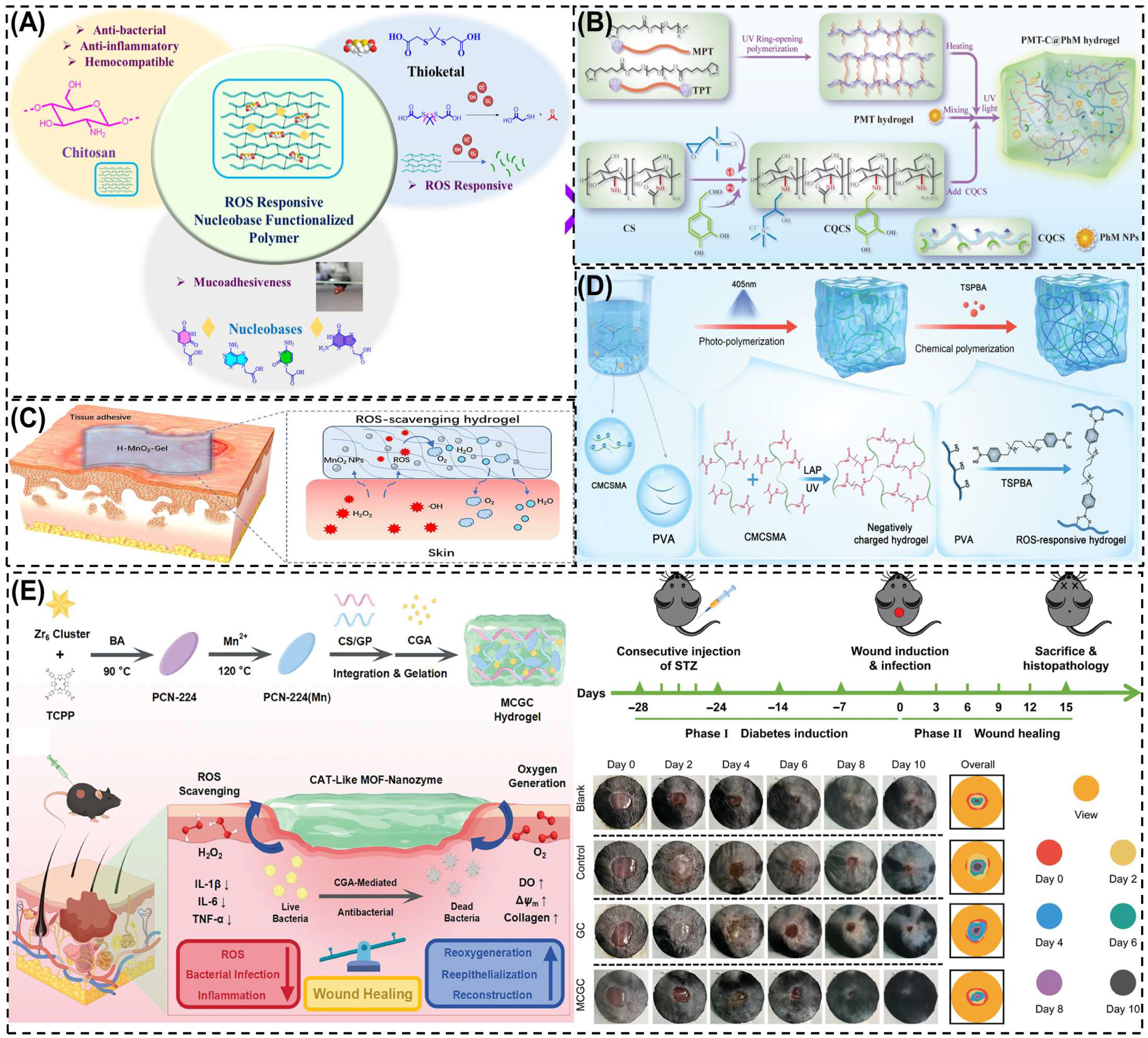 | Single | ROS | CS hydrogel (PMT-C@PhM) with polydopamine-coated MnO2 nanozymes | Induces M2 macrophage polarization and enhances collagen regeneration | [176] |