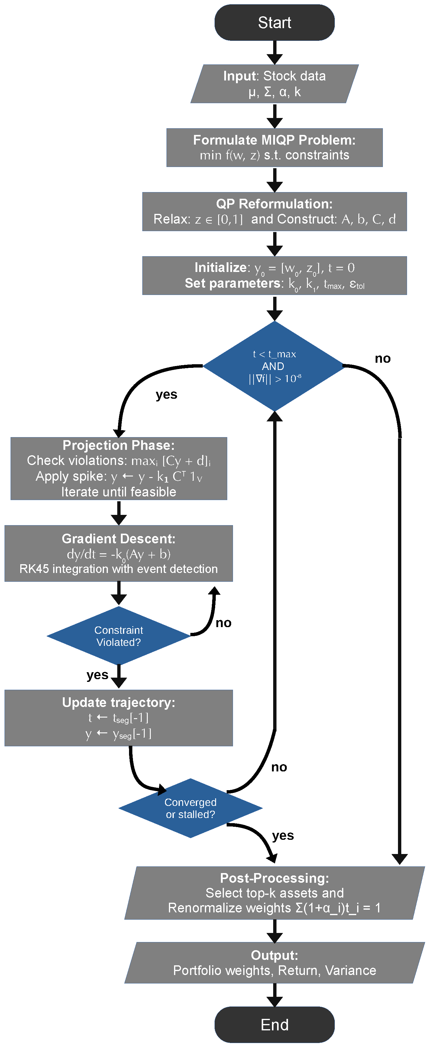Constraint tolerance settings are adapted to problem size. For small portfolios (), we use tight tolerances to enforce near-exact constraint satisfaction. For larger portfolios (), these are relaxed to to accommodate more aggressive projection gains while maintaining numerical stability. The projection tolerance is fixed at throughout, and the maximum integration step size for all experiments.