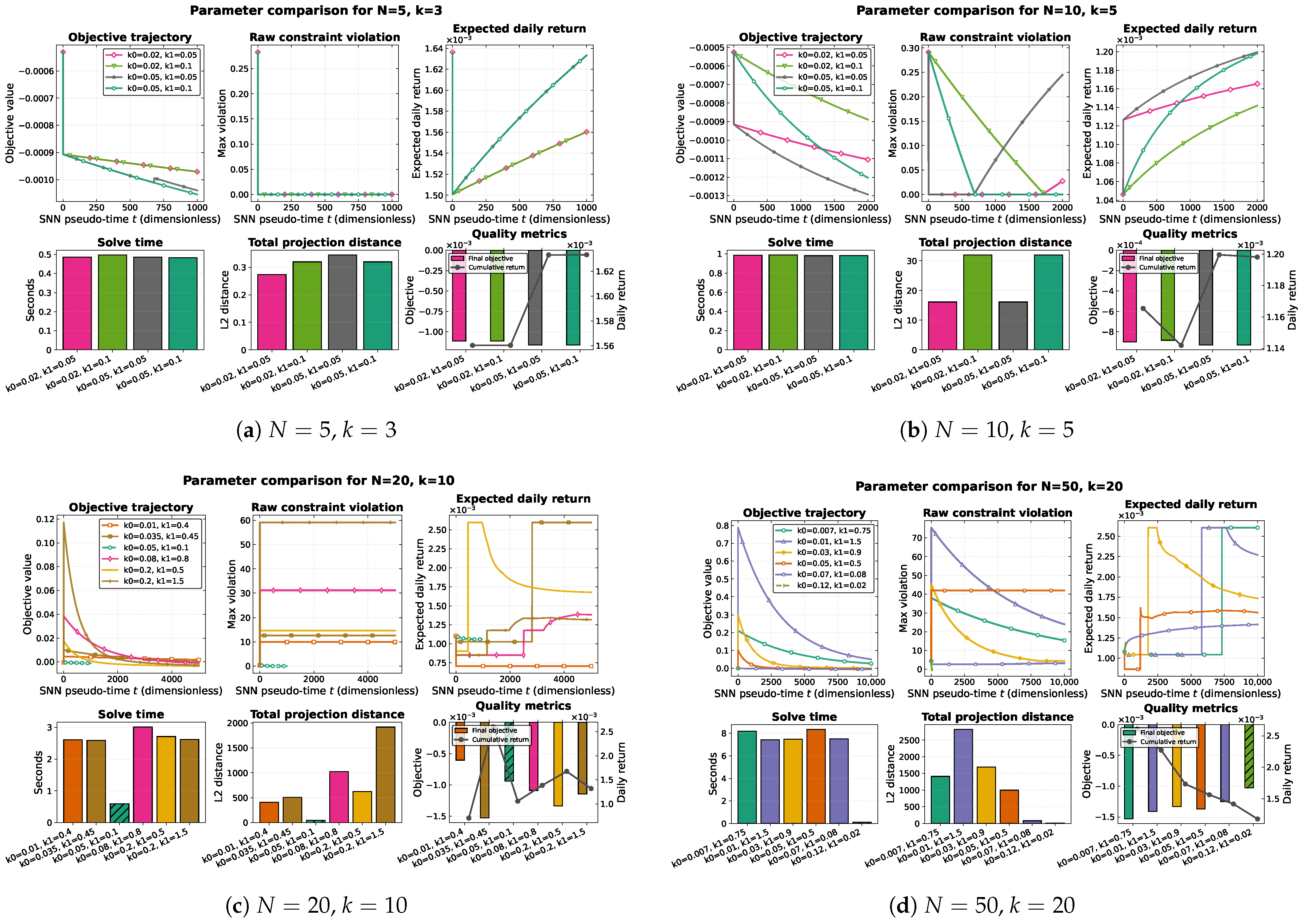 Sensitivity Analysis: Our parameter sweeps demonstrate that solution quality is more sensitive to (projection magnitude) than (gradient rate) for large portfolios, while both parameters have comparable influence for small portfolios. The constraint tolerance settings should be tightened to for small portfolios to ensure near-exact constraint satisfaction, while relaxed tolerances are appropriate for larger portfolios to accommodate aggressive projection gains. The simulation time horizon should be set to 1000 for small portfolios, 5000 for medium portfolios, and 10,000 for large portfolios based on observed convergence patterns.