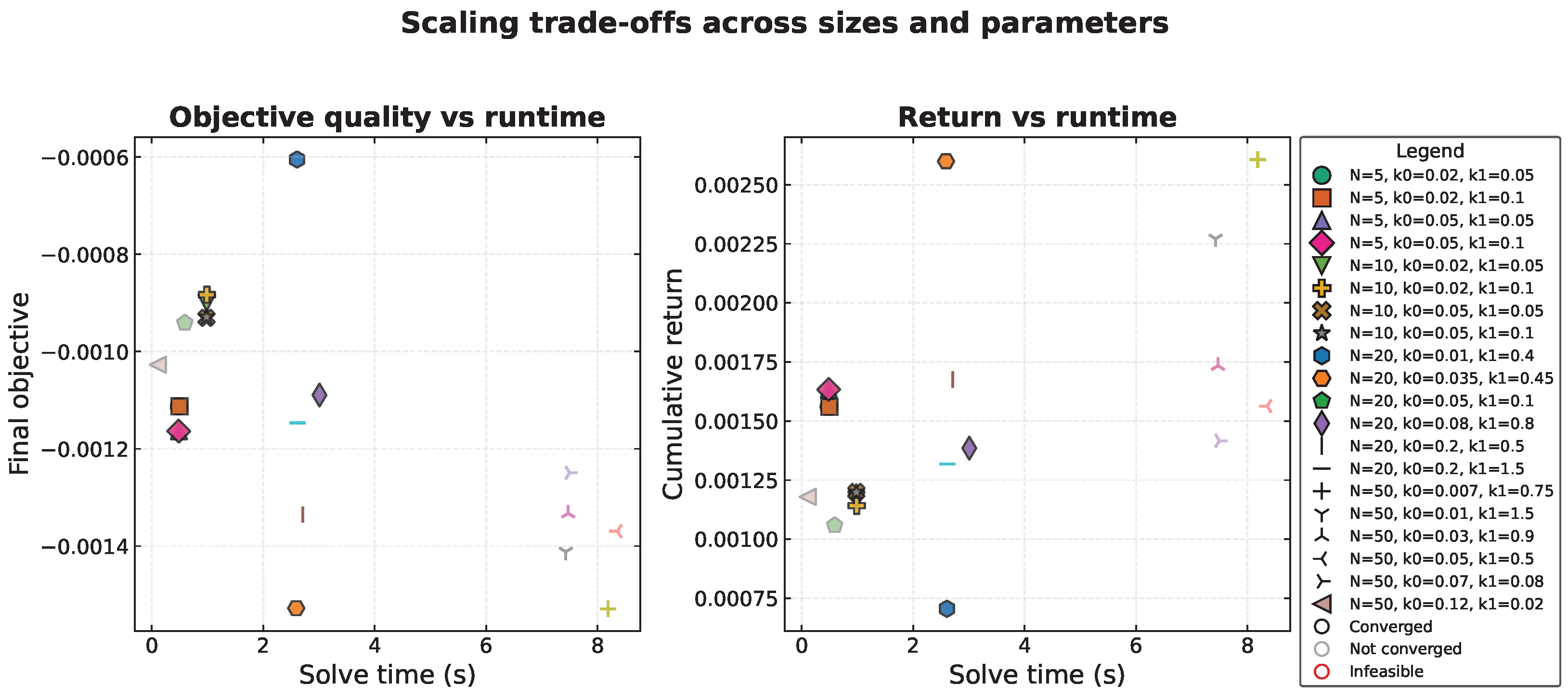 Figure 3 visualize these results. The trajectory panels demonstrate convergence patterns across all problem sizes, showing that post-processing successfully recovers feasible portfolios even when transient violations occur. The scaling analysis reveals smooth runtime growth from 0.5 s for small portfolios to 8.4 s for conservative large-portfolio schedules. Larger problems exhibit tighter clustering on the Pareto frontier compared to smaller universes with flatter efficient frontiers.