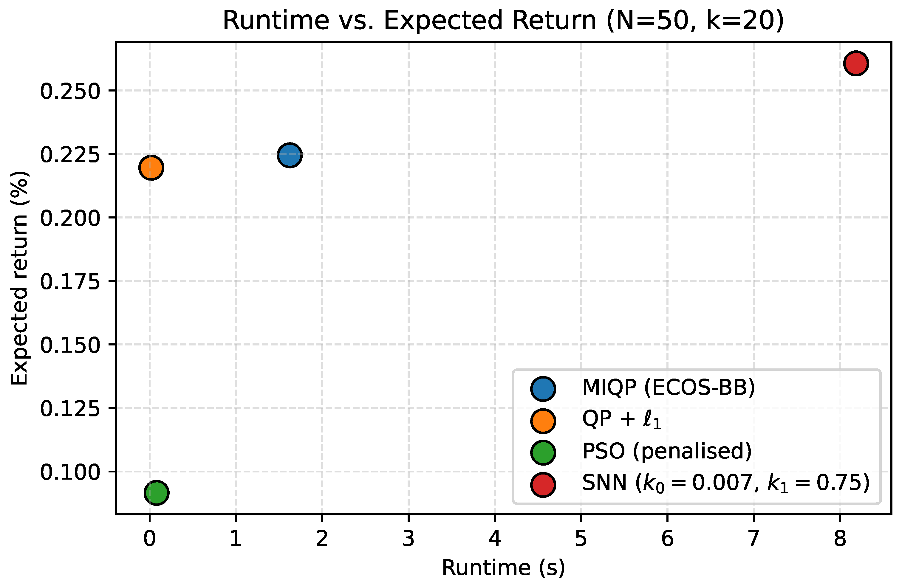 An interesting finding from the baseline comparison is that the SNN solver achieves a higher expected return (0.261% daily) than the exact MIQP solver (0.225%) on the 50-asset portfolio. This performance difference can be understood through several factors. First, MIQP enforces strict discrete constraints throughout optimization via branch-and-bound, which may converge to a local optimum or terminate early due to computational limits. In contrast, the SNN approach initially solves a relaxed continuous problem and enforces discrete constraints only in post-processing, allowing the optimization trajectory to explore a broader solution space before discrete recovery. Second, the higher return achieved by SNN comes with increased risk: SNN exhibits variance of 0.00108 compared to MIQP’s 0.000433, reflecting a different point on the risk-return trade-off curve. Both methods converge to valid near-optimal solutions, but they represent different points on the efficient frontier. This demonstrates the strength of the SNN approach: by relaxing constraints during optimization and recovering discrete solutions through post-processing, it can identify portfolios that achieve competitive or superior returns while maintaining computational tractability. The different constraint handling strategies (strict enforcement vs. relaxation-then-recovery) naturally lead to different local minima, both of which satisfy the problem constraints and represent valid optimization outcomes. We emphasize that all experiments reported here use the same randomly selected subset of 50 stocks from the 100-stock dataset (selected with seed = 42), ensuring that performance differences reflect algorithmic characteristics rather than data selection effects.
