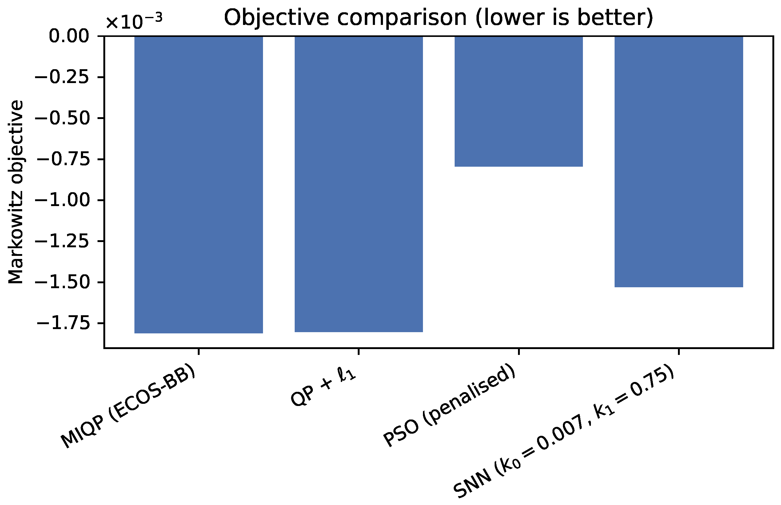 The baseline comparison demonstrates that the SNN solver matches MIQP solution quality while avoiding the exponential scaling inherent in branch-and-bound methods. Unlike PSO, which lacks convergence guarantees, the SNN dynamics build on the theoretical foundation of projected gradient descent for constrained quadratic programs. The moderate overlap in asset selections (Jaccard similarity 0.14–0.29) reflects the multiplicity of near-optimal solutions: different optimization paths converge to different asset combinations with similar risk-return characteristics. This diversity is expected in portfolio optimization, where the efficient frontier contains many portfolios with comparable objectives. The top-k recovery procedure reliably identifies feasible discrete portfolios, though the specific asset mix depends on the optimization trajectory.