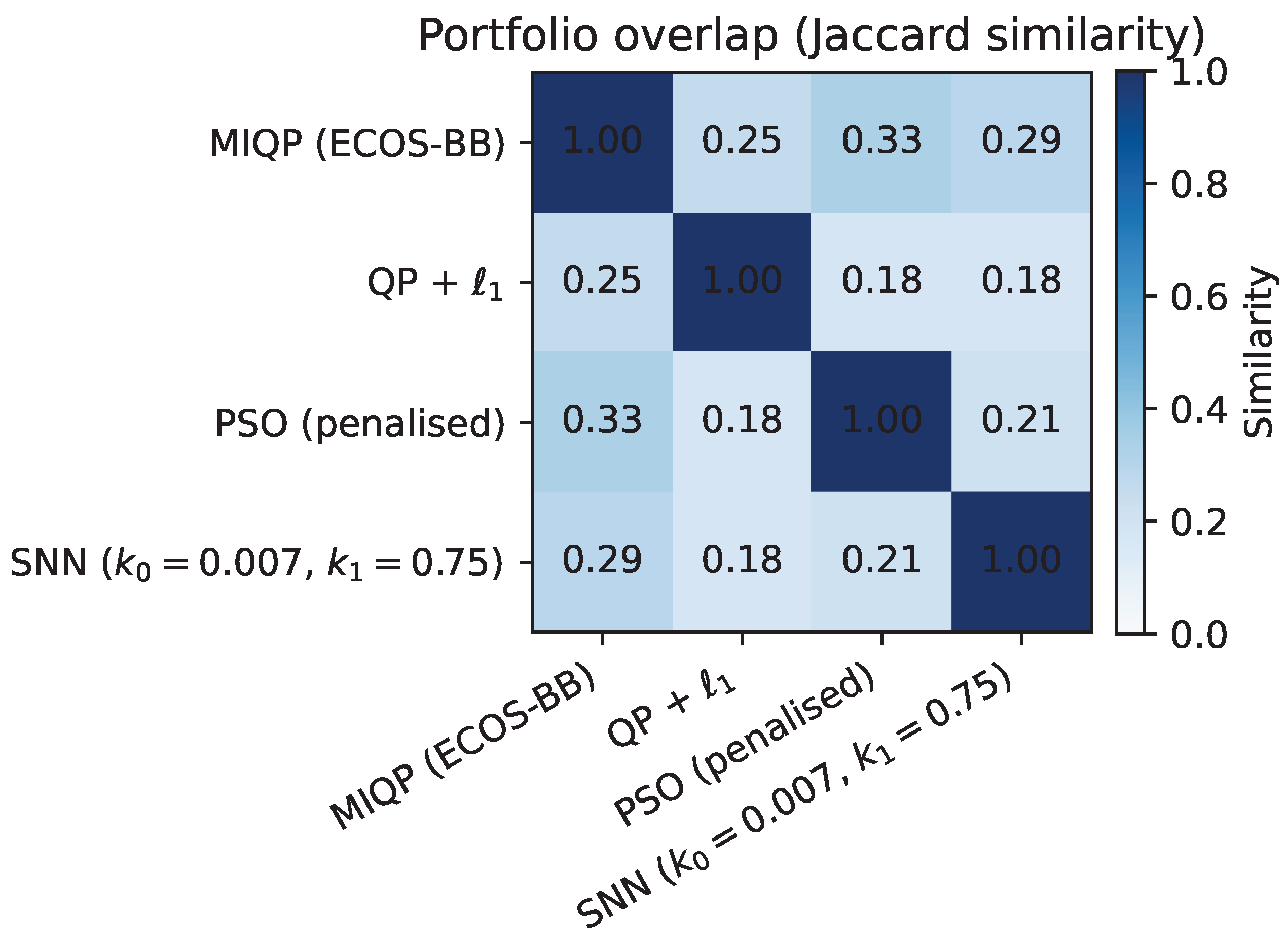 Figure 6 reveals moderate overlap in asset selections across methods, with Jaccard similarities ranging from 0.14 to 0.29. This moderate overlap reflects the inherent multiplicity of near-optimal solutions in portfolio optimization: different methods converge to different asset combinations that achieve similar risk-return profiles. The SNN solver exhibits Jaccard similarity of 0.29 with both MIQP and PSO (sharing 9 common assets), and 0.18 with QP +