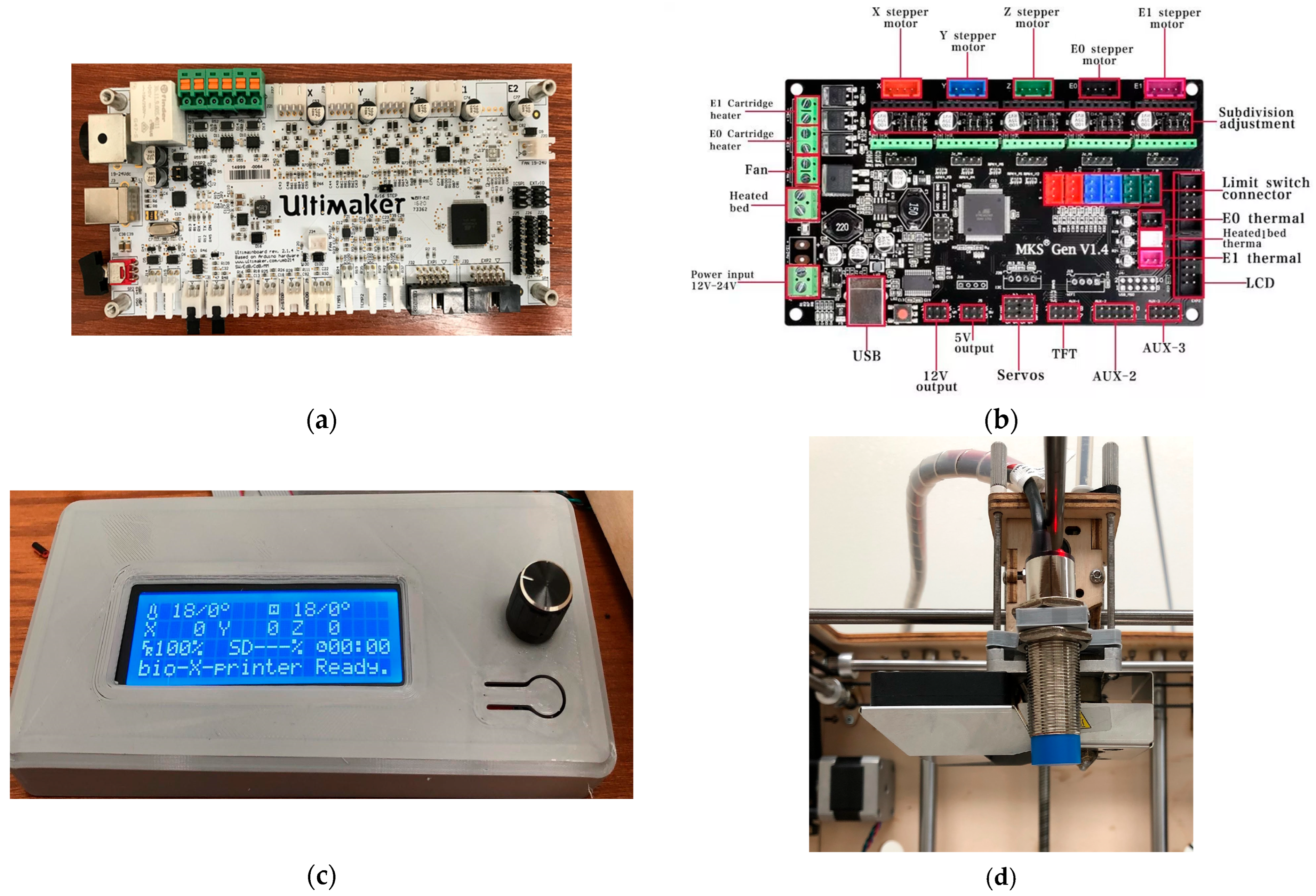 Figure 5). As with the first prototype, the stock Ultimaker controller was replaced by an MKS GEN V1.4 running Marlin (Makerbase Technology Co., Ltd., Shenzhen, China) to simplify firmware changes (e.g., offsets and soft limits) during integration and tests.