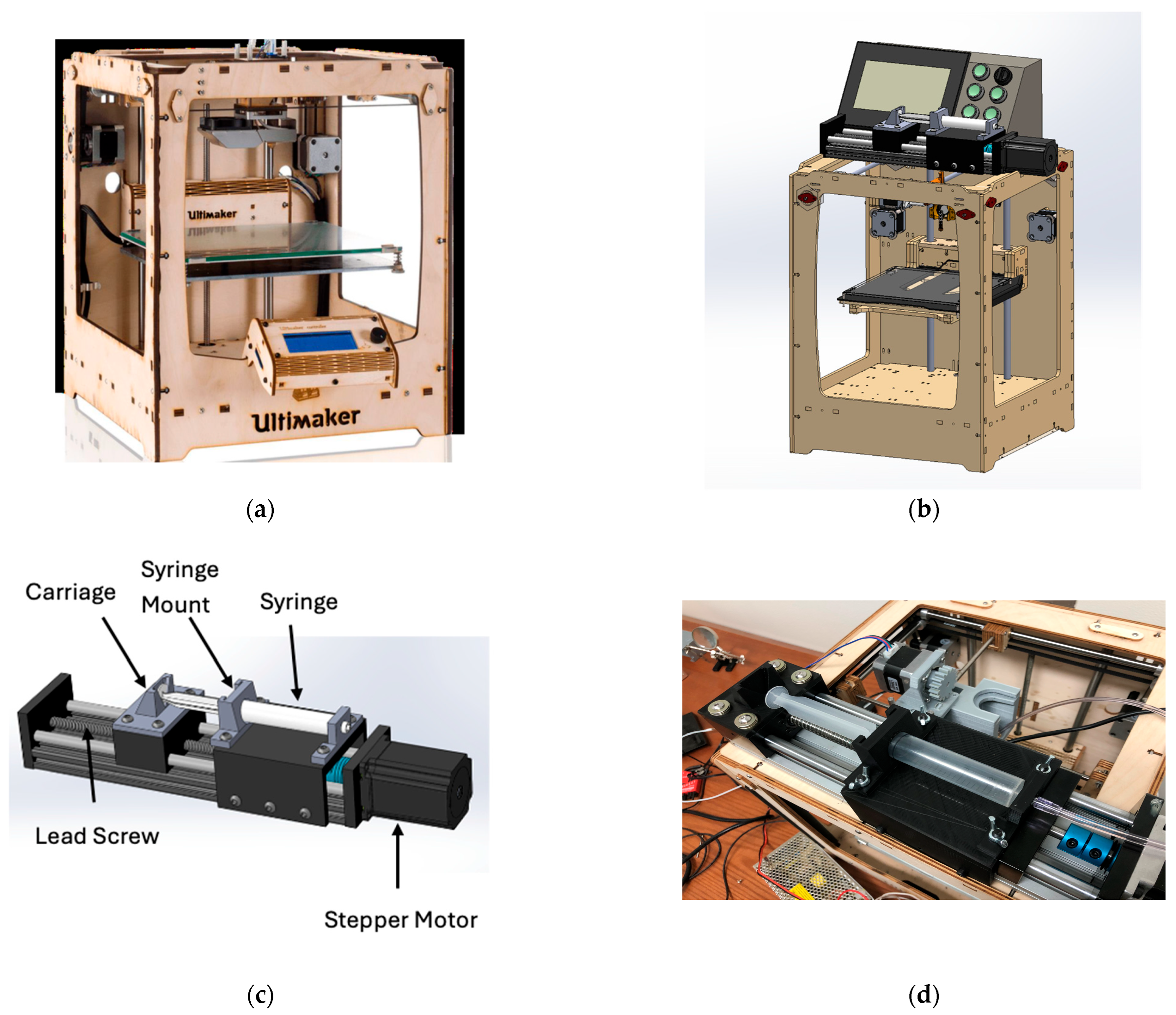 23]. (3) A FlashForge Creator Pro was converted to a syringe-based DIW toolhead for soft materials (EcoFlex 00-31 and gelatin–alginate), illustrating straightforward replacement of a thermoplastic extruder with a piston-driven syringe module [