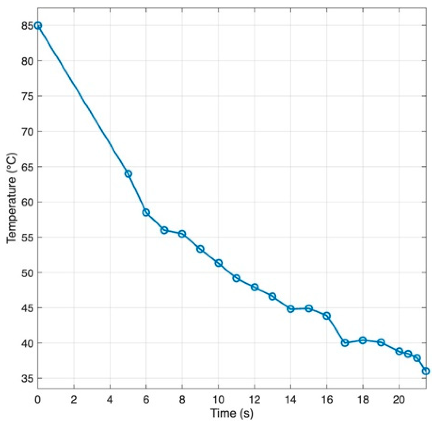 Figure 7, with a heated sleeve on the syringe, the representative agar/alginate blend cooled from ~85 °C at the barrel to the 60 °C printing set point in about 6 s by the time it reached the nozzle. Operationally, extrusion was triggered ~6 s before toolpath arrival so that flow onset coincided with the nozzle reaching the start point.