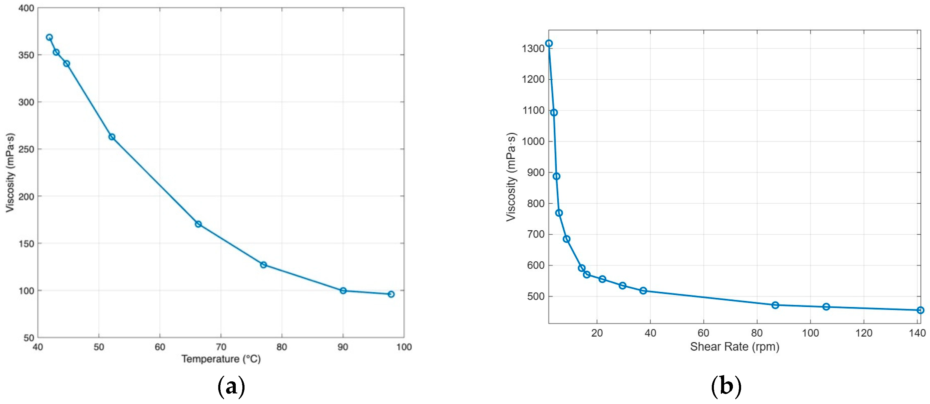 Figure 8 demonstrated that the ink shows clear shear thinning at room temperature, with viscosity dropping quickly as the shear rate increases. This allows easy flow through the nozzle and recovery of viscosity once the shear stops. Viscosity also falls as temperature rises. For the working blend, the apparent viscosity is about 220 mPa·s under 60 °C at a shear rate of 100 rpm and it continues to decline with further heating, while cooling produces a sharp increase. During printing, the syringe and nozzle should be kept warm enough to maintain consistent flow, but not so warm that deposited strands lose definition. After deposition, controlled cooling keeps each filament warm long enough to fuse with the previous layer, then allows gelation to hold the shape. This balance prevents clogging and under-extrusion and preserves dimensional accuracy.