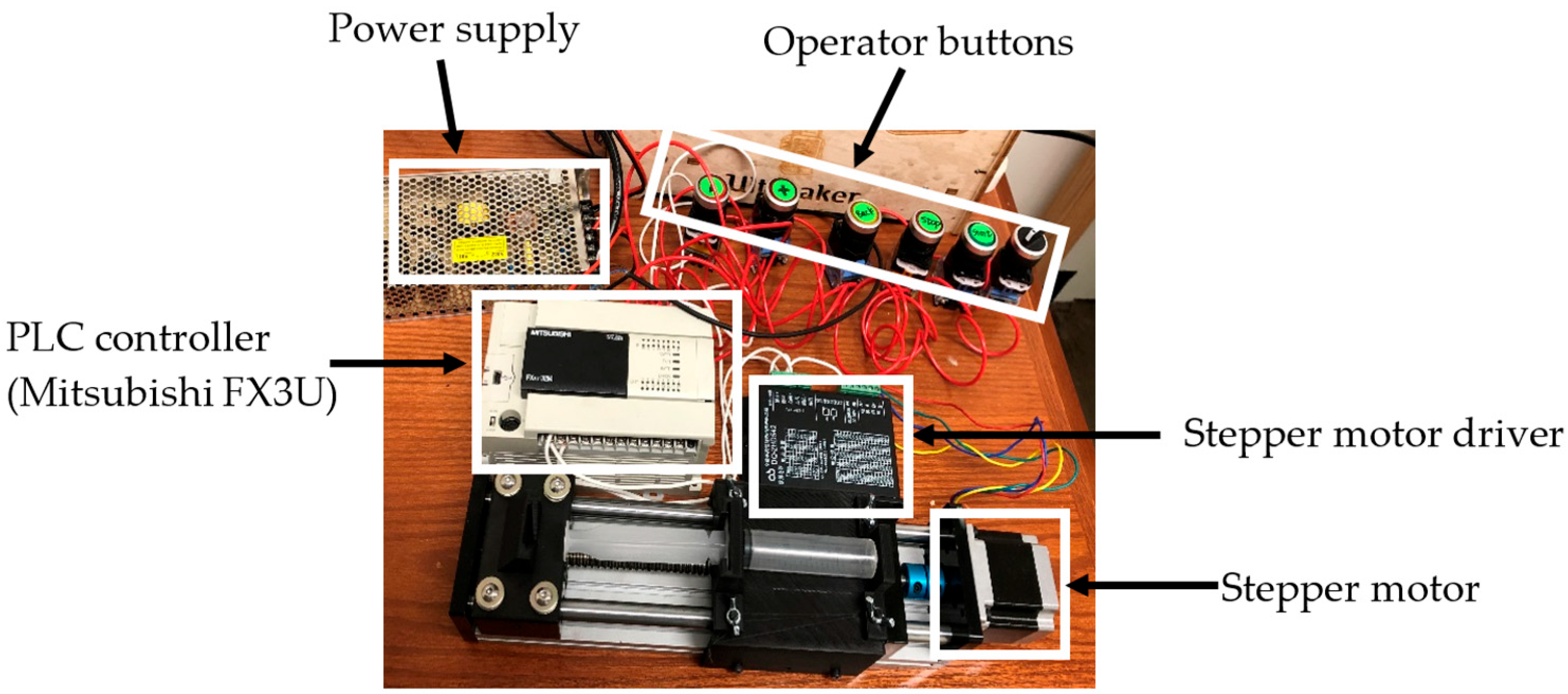 In Design #3, extrusion actuation was separated from gantry motion using a decoupled control architecture. The original printer controller continued to command XYZ motion, while a PLC drove the syringe stepper motor. The PLC program implemented operator controls for acceleration, deceleration, start, stop, homing, and direction switching through dedicated inputs, allowing the extrusion rate to be tuned to ink rheology without altering motion firmware. The PLC and drive electronics were integrated with the remote piston-driven module so that force generation was offloaded from the printhead, preserving working volume on the modified desktop FDM frame.
