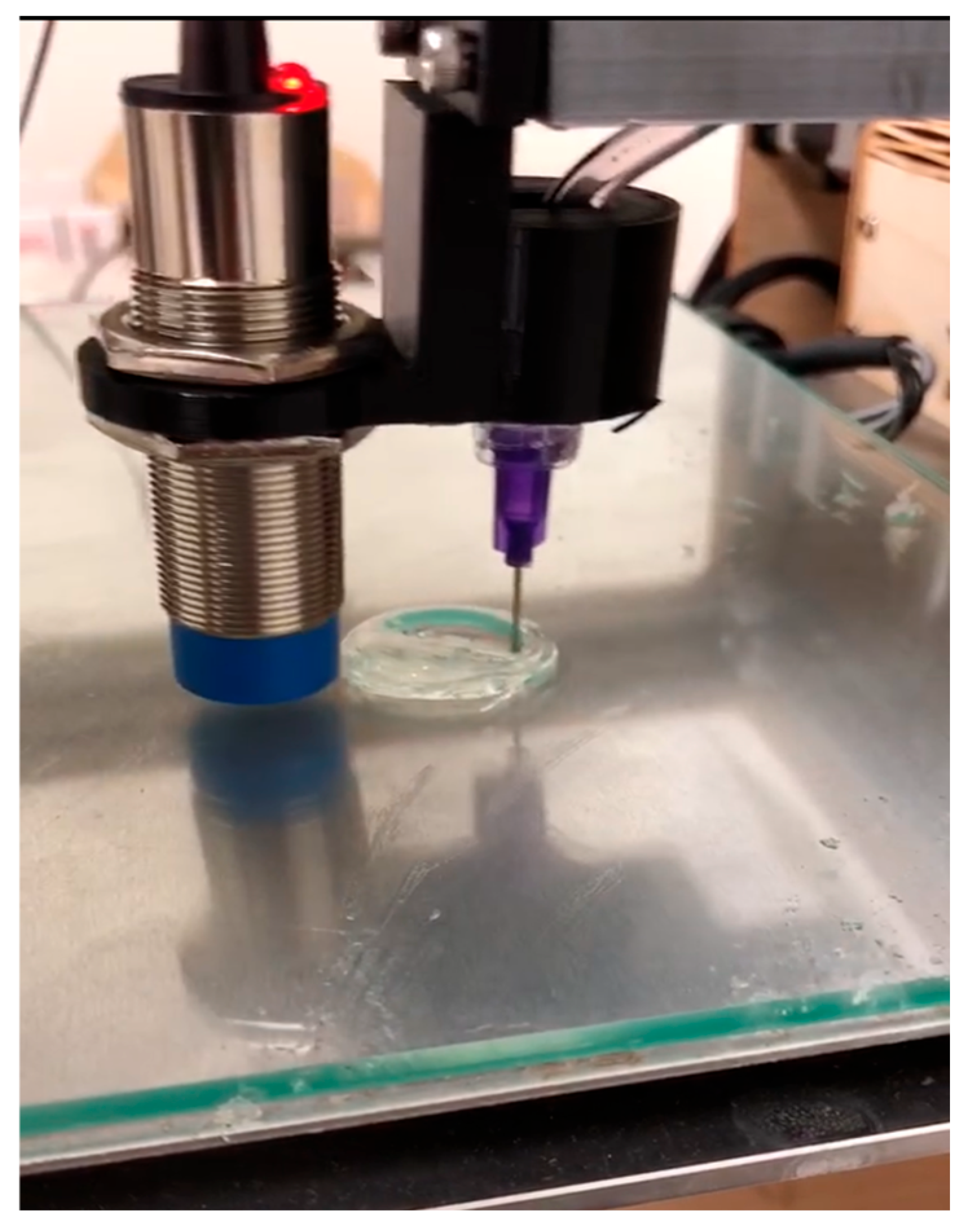 Figure 2). Specifically, a printed PLA clamp with locking lips secured the syringe barrel, one with a simple heated sleeve stabilized barrel temperature, and a long needle served as the dispensing nozzle. The assembly mounted to the Ultimaker XY carriage using the original linear bearings. A small bracket co-located the capacitive probe with the needle tip to support automated Z-offset calibration. A carriage-mounted NEMA-17 motor (Wantai Motor, Shanghai, China) drove a spur gear that engaged a printed rack. The rack pushed a latched pusher linked to the syringe plunger, producing the required linear extrusion stroke. Firmware coordinate offsets and soft travel limits were updated for the new toolhead geometry, and motion profiles were tuned for slow, uniform feed to accommodate semisolid flow.