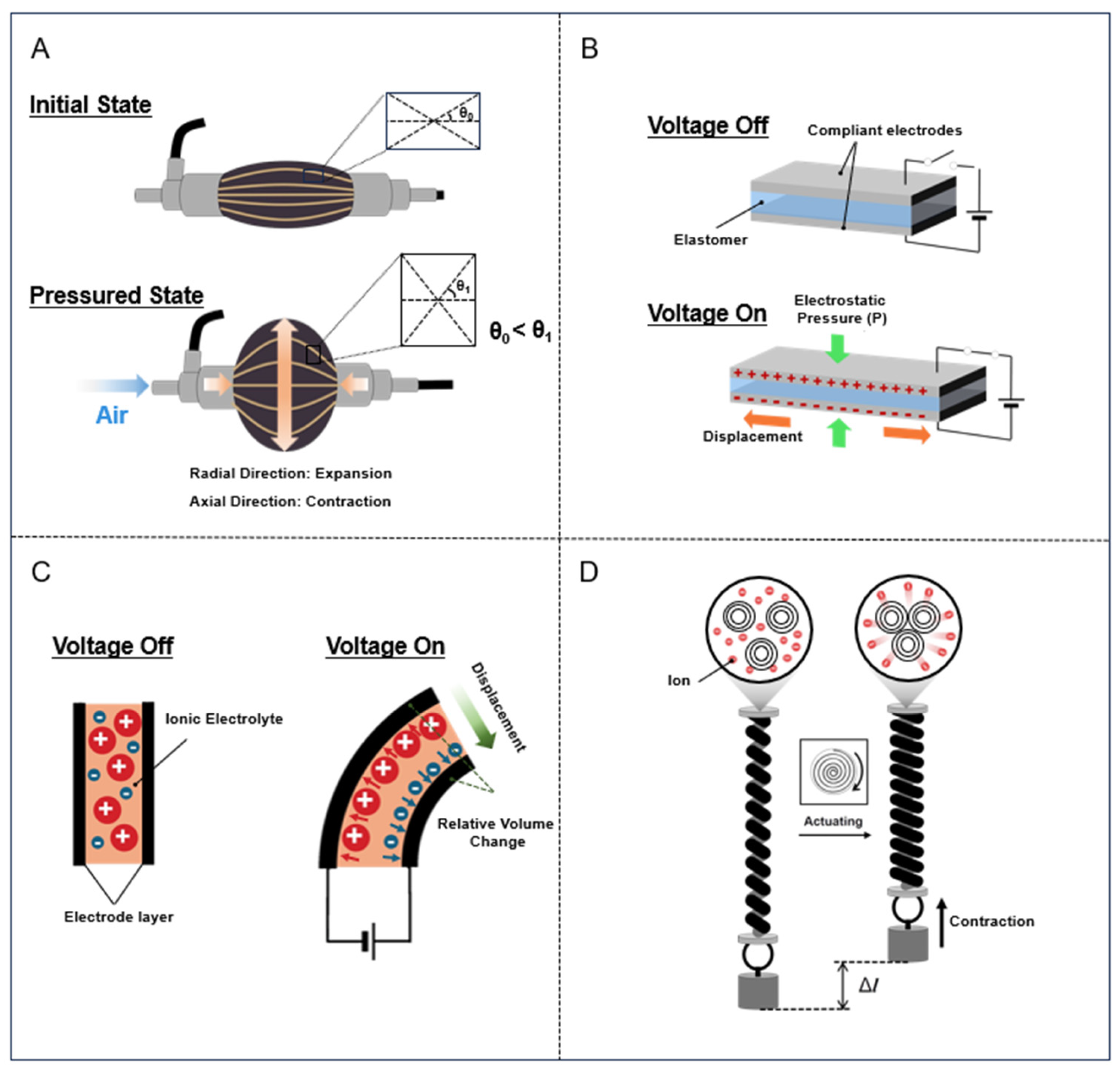 Polymers serve as the cornerstone of many artificial muscle technologies because of their low cost, light weight, high elasticity, intrinsic compliance, and amenability to scalable fabrication and chemical modification. Despite the diversity of polymeric systems, polymer-based actuators can be broadly categorized according to their fundamental actuation mechanisms. The primary distinction can be drawn between pneumatic artificial muscles (PAMs), which employ fluid pressure to generate large contractile forces, electronic EAPs, which are directly activated by electric fields, and ionic EAPs, which operate via ion transport.