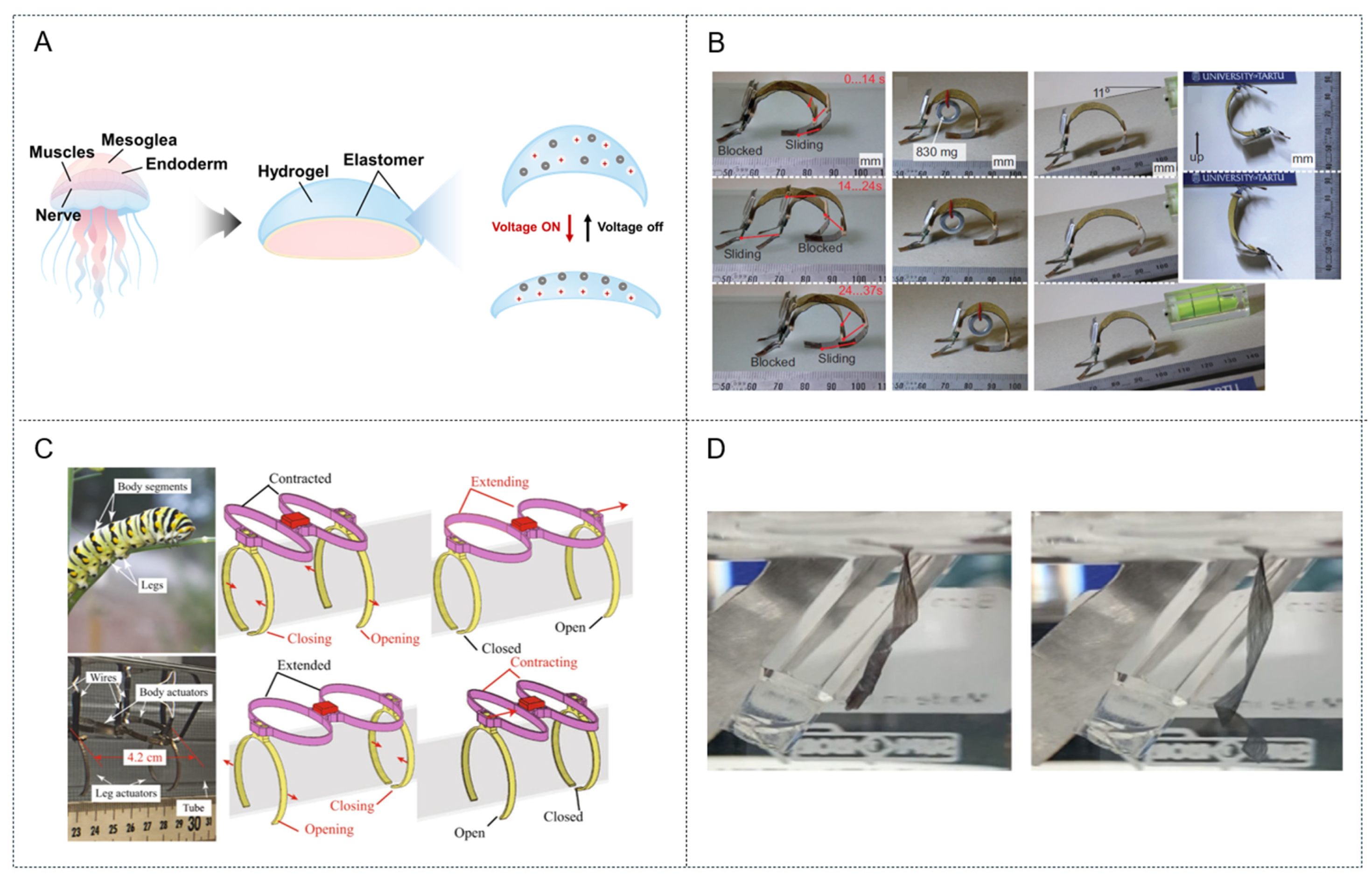 C) 3D-printed IPMC soft crawling robot inspired by a caterpillar. (Reproduced with permission from Carrico et al. [