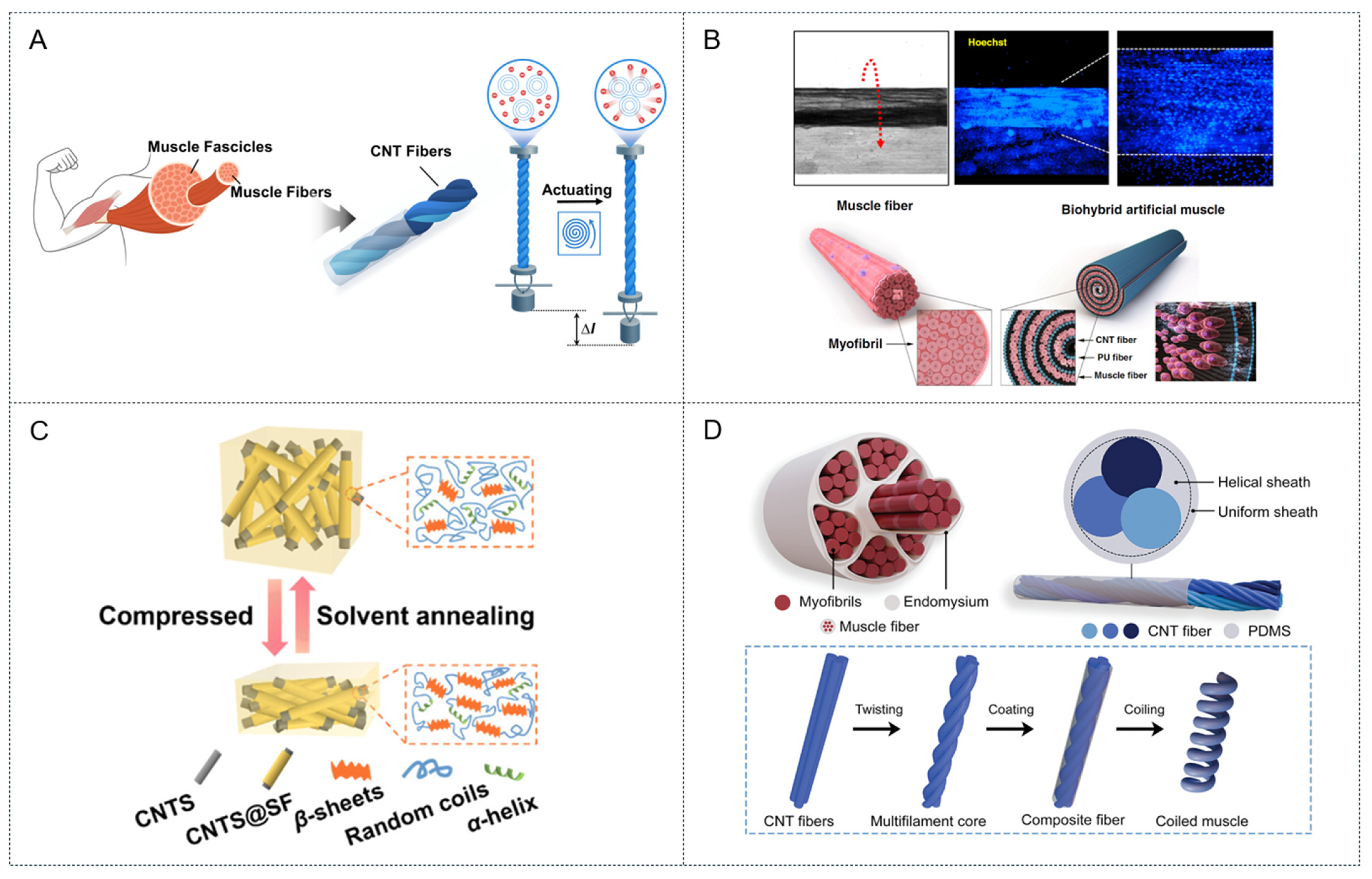 Natural muscles rely on hierarchical organizations and helical filament arrangements to amplify molecular interactions into macroscopic contraction. Similarly, CNT yarn actuators employ twist- and coil-induced architectures to convert minute dimensional changes in CNTs into significant torsional and tensile strokes that can surpass the performance of biological muscles [