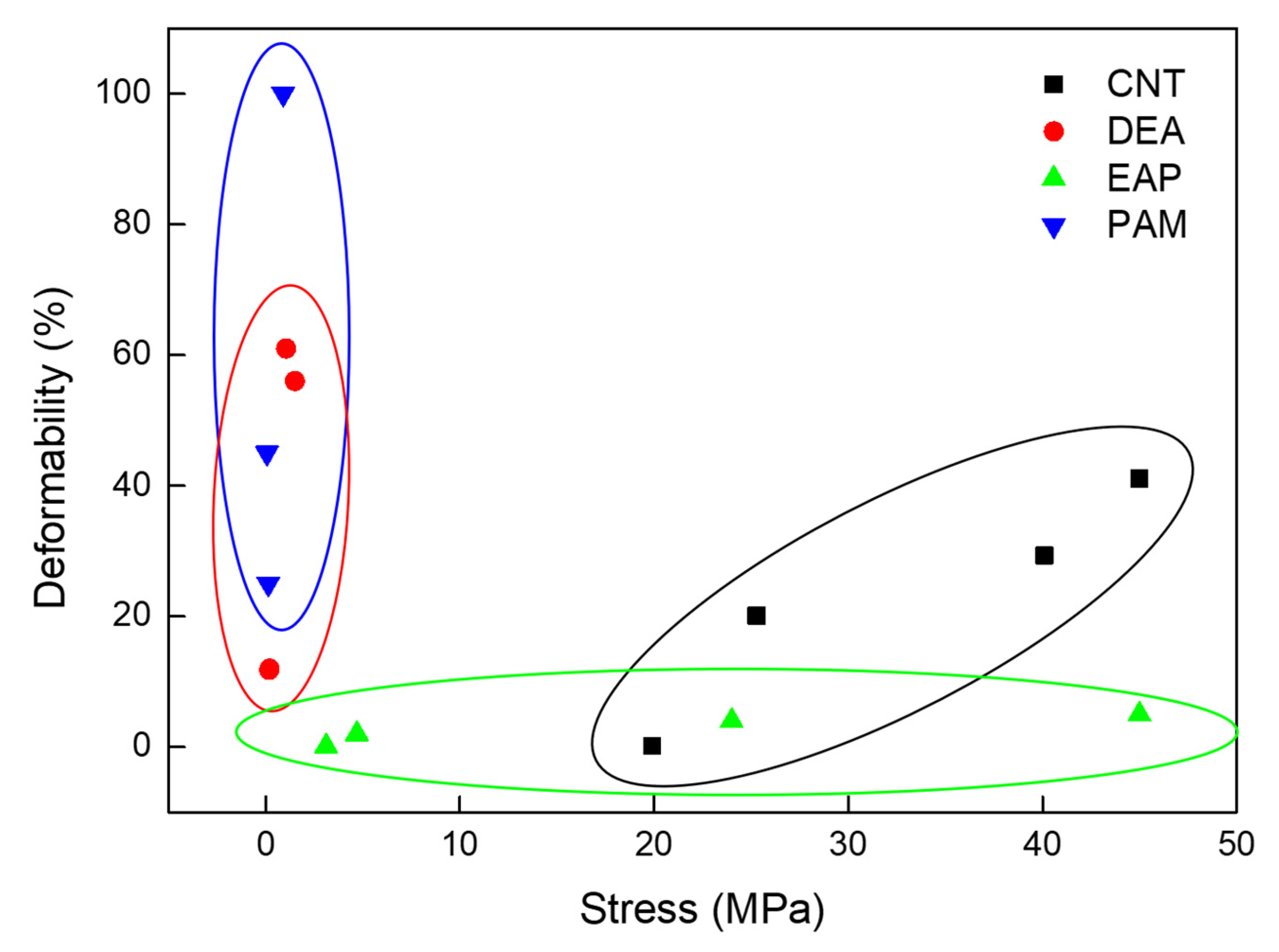 Table 1). To visualize the distinct performance regimes of the discussed technologies, we present a performance map correlating actuation stress and strain in