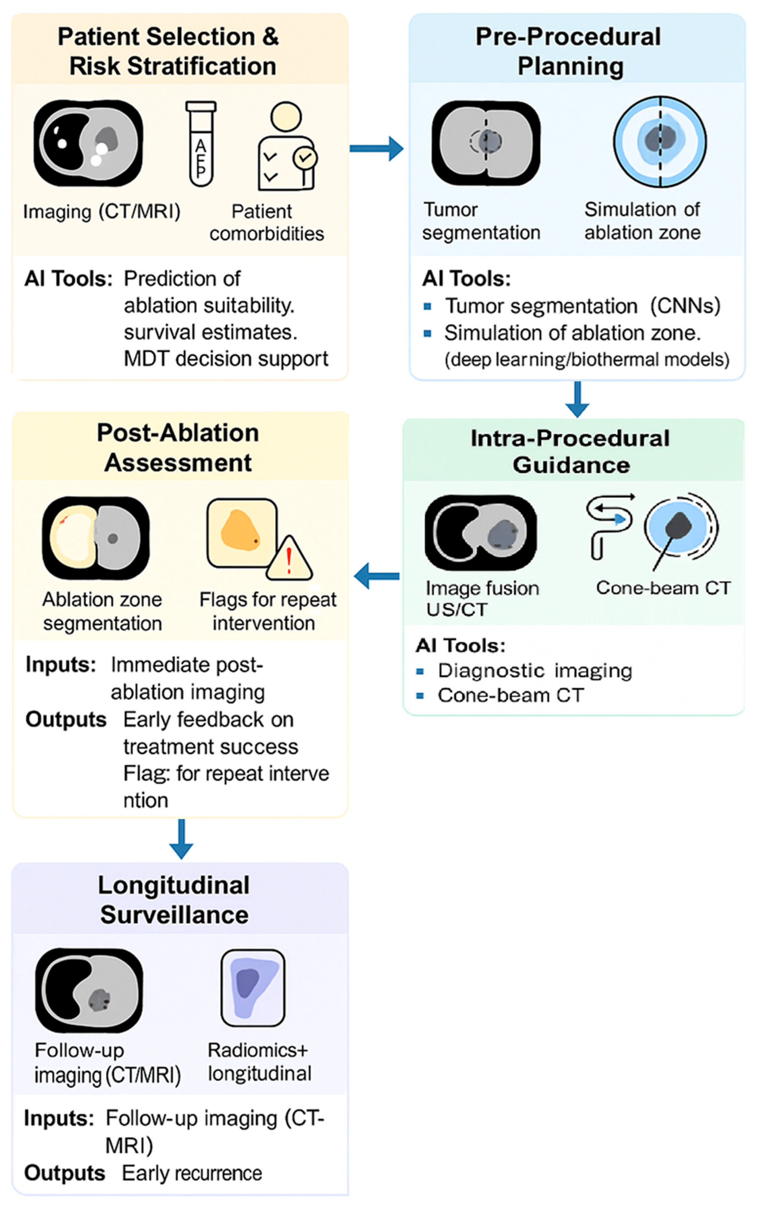 AI technologies are increasingly being integrated into various stages of the thermal ablation workflow, from patient selection to post-treatment evaluation. Building on the general AI methods outlined in