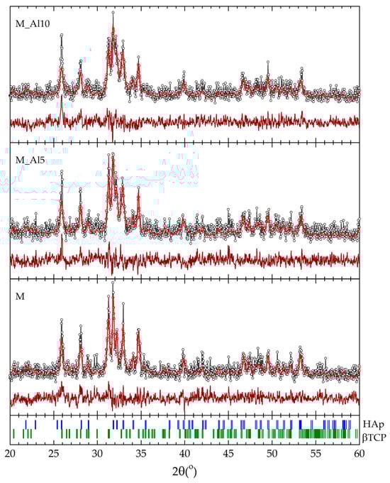 The crystalline structure of the as-prepared samples was investigated by X-ray diffraction. XRD patterns indicate the presence of HAp and β-TCP in the as-prepared samples. To estimate the phase distribution, the data collected within the 2θ range of 20° to 60° was analyzed using the Rietveld refinement method. The calculated profiles are shown in Figure 1 together with the experimental data and the results are presented in Table 1. All diffraction maxima are attributed to the hexagonal HAp P63/m and rhombohedral β-TCP R3c structures. The Al-doped samples show a significantly higher content of HAp, while the lattice parameters seem to be unaffected by the Al content and in very good agreement with the values reported in literature for the two phases [7,8,26,40,41,42,43,44].