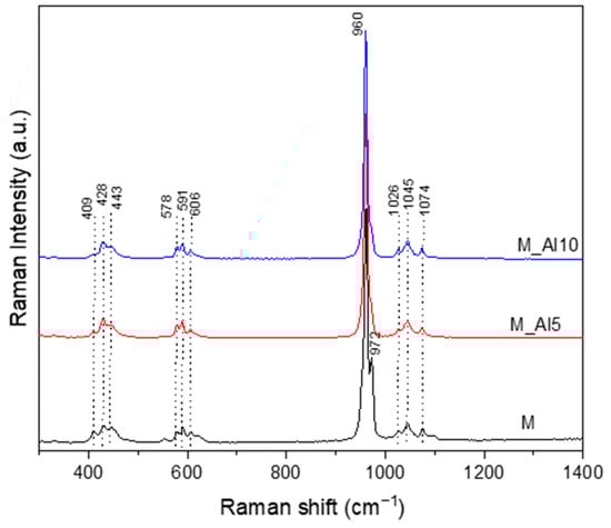 The Raman spectra, illustrated in Figure 3, present an intense maximum at 960 cm−1 corresponding to the ν1 vibration of PO43−, the symmetric stretching of P–O bonds. This band is reported in the literature at 964 cm−1 for commercial HAp and 961 cm−1 for bone, with small shifts for β -type carbonated hydroxyapatite [46,57]. In biphasic calcium phosphate compositions, the ~960 cm−1 band reflect the formation of hydroxyapatite phase [58]. The Raman spectra of sample M present a sharp band at 972 cm−1 related to ν1 symmetric stretching of PO43− characteristic of β-tricalcium phosphate [46]. A visible broadening of this band with Al-ion addition indicates a lattice rearrangement that suppresses the β-TCP phase. In the 400–450 cm−1 region, three weak peaks were detected. The Raman band at ~409 cm−1, most clearly resolved in sample M, is assigned to the ν2 (O–P–O) bending mode of the phosphate group (PO43−), characteristic of β-tricalcium phosphate (β-TCP) and detectable in dicalcium phosphate phases [46,58]. Bands centred at 428 and 443 cm−1 were attributed to the bending (ν2) vibrational mode of P-O bonds from PO43− units in both HAp and β-TCP phases [58,59,60,61]. The asymmetric bending vibration, ν4 of P-O bonds generates Raman bands in the 550–650 cm−1 domain [59]. In the region around 100–1100 cm−1, three bands assigned to the asymmetric stretching vibration, ν3 of P–O bond, is identified [57,58,59,60,61].