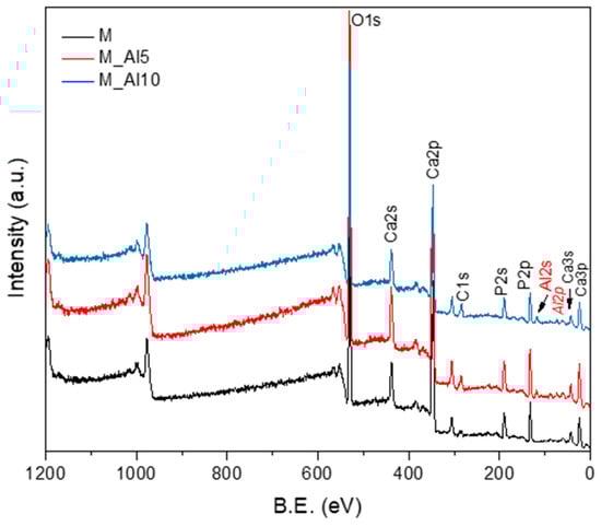 The X-ray photoelectron spectroscopy (XPS) is one of the most widely used techniques of surface analysis used to determine, from binding energy (BE) of ejected electrons, the elemental composition of materials to a depth of up to 2.5 nm from a surface. Even though the surface may not be representative of the bulk material due to an eventual contamination by reaction and/or deposition, it is essential to characterize it, since it is this outer surface that first contacts body fluids on implant [63]. The XPS survey spectra of the synthesized samples, shown in Figure 4, provide insights into their surface composition. The survey spectra were analyzed in terms of peak intensities and positions, to identify all constituent elements (O, P, Ca, Al). The elemental surface compositions of the samples, determined from the XPS analysis, are reported in Table 2, reflecting the distribution of surface species. The Ca/P ratio in the analyzed samples are lower than those for pure HAp (1.66) or β-TCP phase (1.5) reflecting the biphasic nature of these samples.