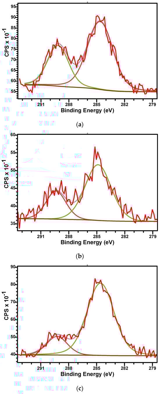 The high-resolution XPS spectra of C1s, O1s, Ca2p, and P2p for all as-prepared samples are presented in Figure 5, Figure 6, Figure 7 and Figure 8. The high-resolution spectra of C1s (Figure 5) shows two distinct signals in narrow ranges of 284.6–284.8 eV and 289.2–289.4 eV. These energies were associated with the C-C bond (284.6–284.8 eV) and with carboxyl groups O-C=O (289.2–289.4 eV). Second component confirms the presence of carbonate group (CO32−) within the material’s structure and, in consequence, the development of β-TCP phase in all samples. The ratio between the areas that cover the C-C and O-C=O contribution in the high-resolution spectra increases with the aluminium ions content increased from 2.06 to 2.6 and 5.34. This suggests that Al3+ disadvantages the β-TCP phase, also observed in the XRD analysis.