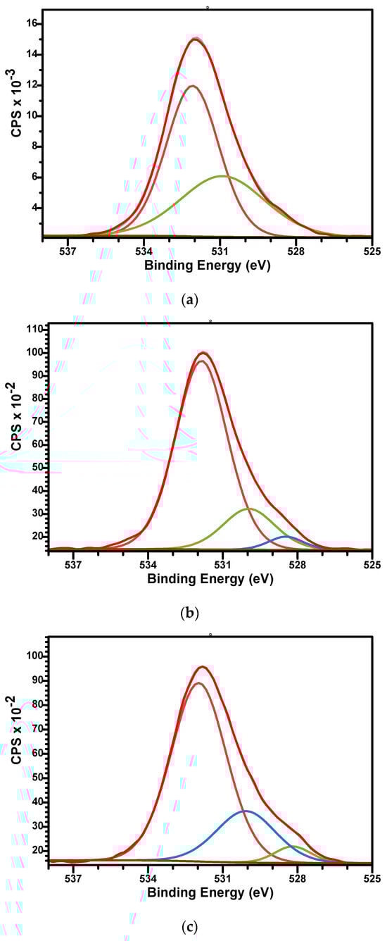 The high-resolution spectra of O1s for sample M (Figure 6a) can be fitted by two components while the spectra of M_Al5 and M_Al10 request three. For sample M, the signal at BE of 532.08 eV is associated with the P-O bonds while the signal at BE of 530.89 eV is associated with P-O, hydroxyl (OH−) groups, and C-O bonds [47]. For Al-containing samples (Figure 6b,c), three peaks were used to fit the signal with BE around 531.8, 530, and 528.5 eV. The first two peaks were associated similar with those of sample M while the lowest signal at 528.5 eV could be assigned to the Al-O bonds [64].